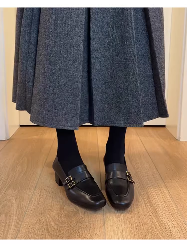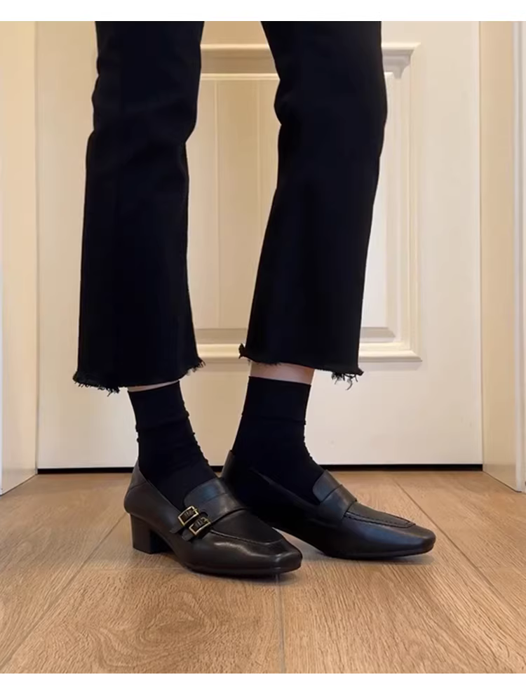 - Phiên bản da cừu ~ Giày lười đế dày có gót dành cho nữ, giày da nhỏ có khóa thắt lưng màu đen đa năng, giày đơn nhỏ cổ điển bằng da thật.