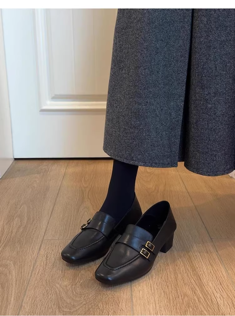 Phiên bản da cừu ~ Giày lười đế dày có gót dành cho nữ, giày da nhỏ có khóa thắt lưng màu đen đa năng, giày đơn nhỏ cổ điển bằng da thật.