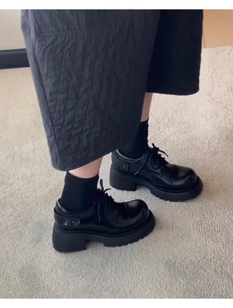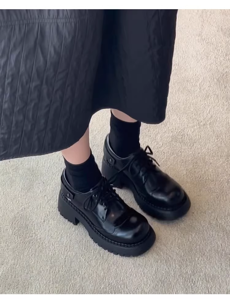 - Phiên bản da cừu ~ Giày lười đế dày dành cho nữ, giày da thật buộc dây cắt sâu, giày da nhỏ gót dày đa năng phong cách Anh quốc