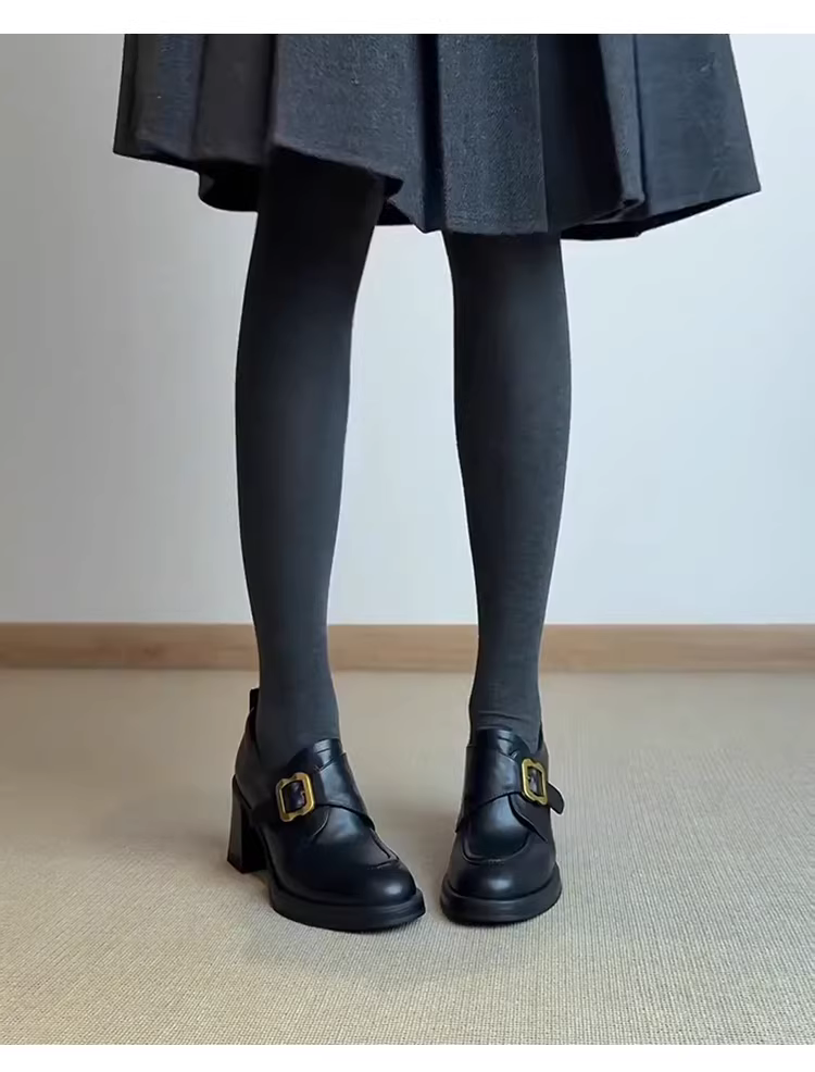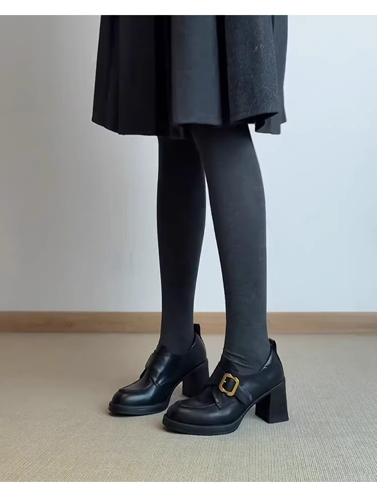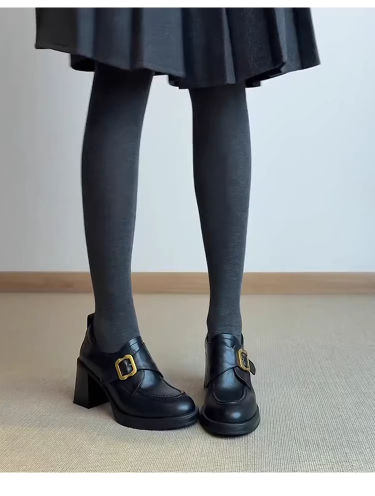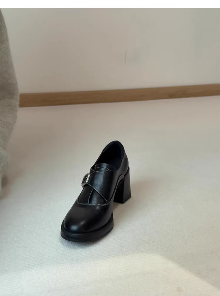 Phiên bản da cừu ~ Giày lười đế dày màu đen phong cách cổ điển của Anh dành cho nữ, giày da cao gót có khóa thắt lưng kiểu dáng cổ điển
