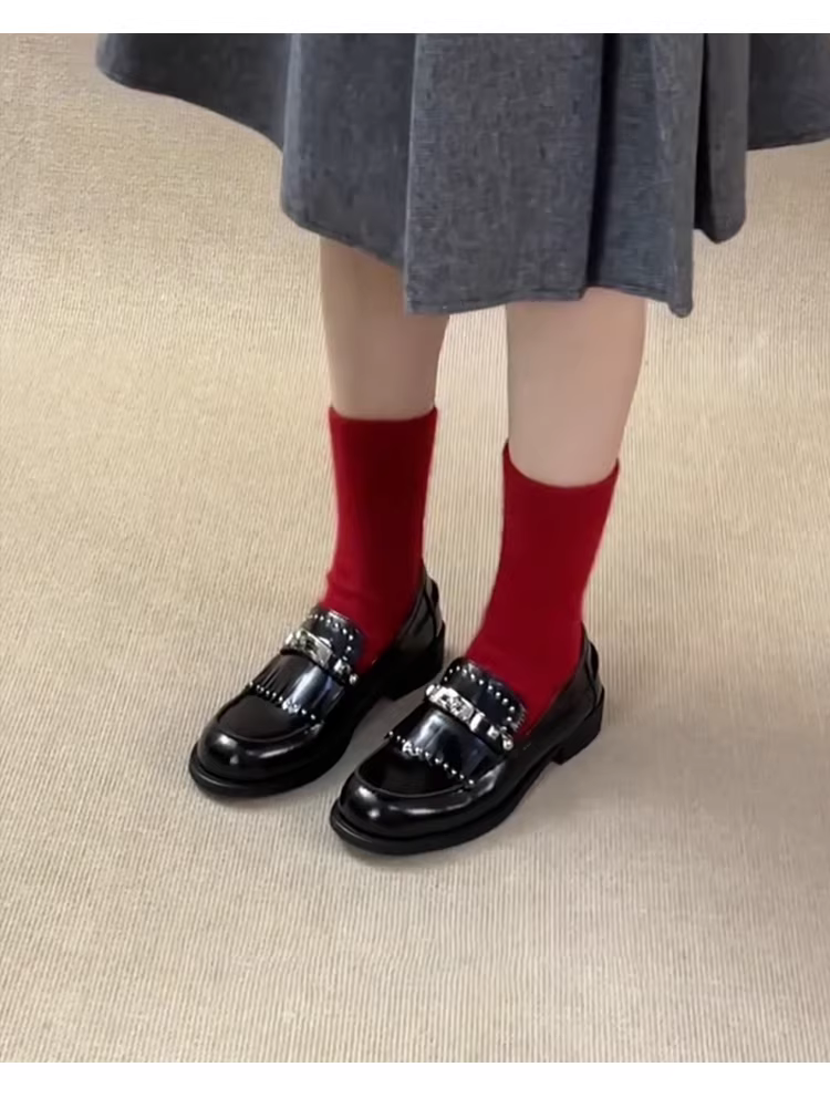Phiên bản da cừu ~ Giày lười kiểu Anh mới dành cho nữ với khóa kim loại, đinh tán, tua rua, giày da đế thấp kiểu slip-on