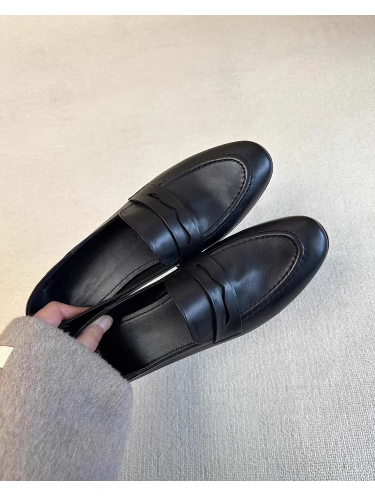 Phiên bản da cừu ~ Giày lười kiểu cổ điển giúp thon gọn dáng người, giày lười đa năng dành cho nữ, kiểu dáng đơn giản, gót dày, mũi tròn, giày da nhỏ