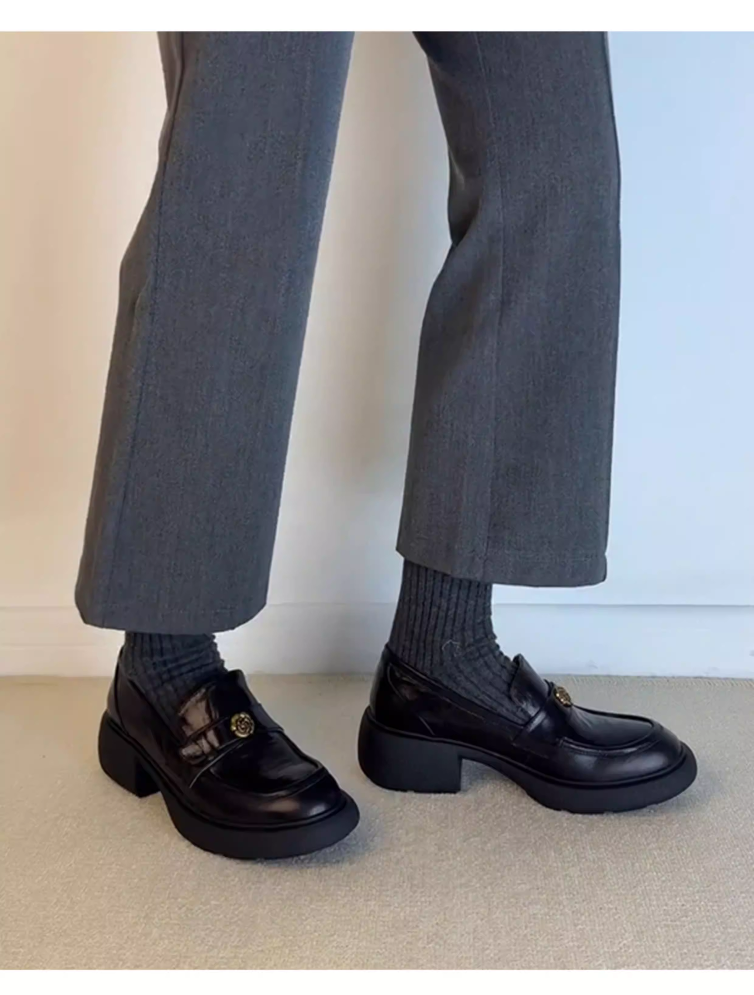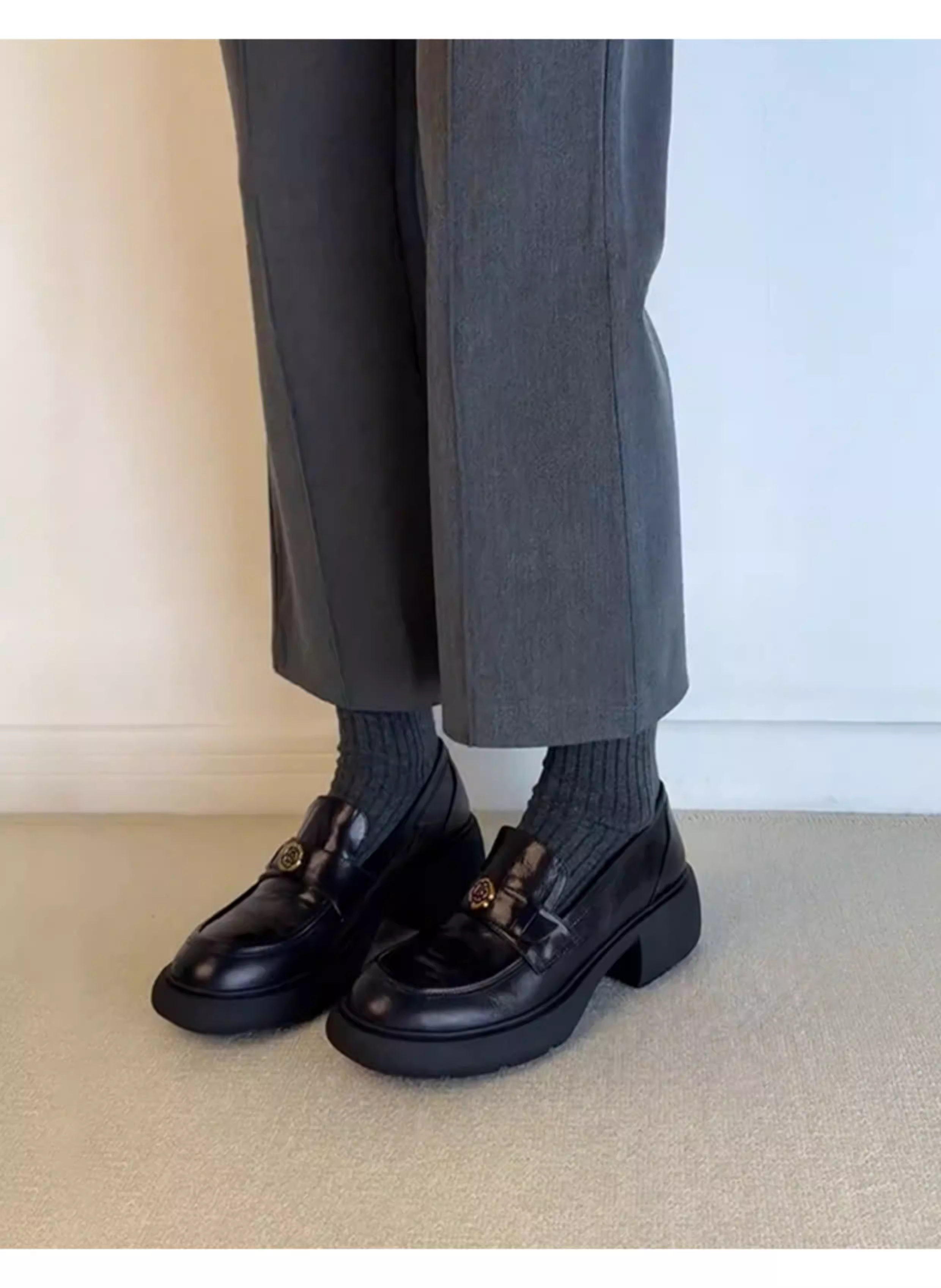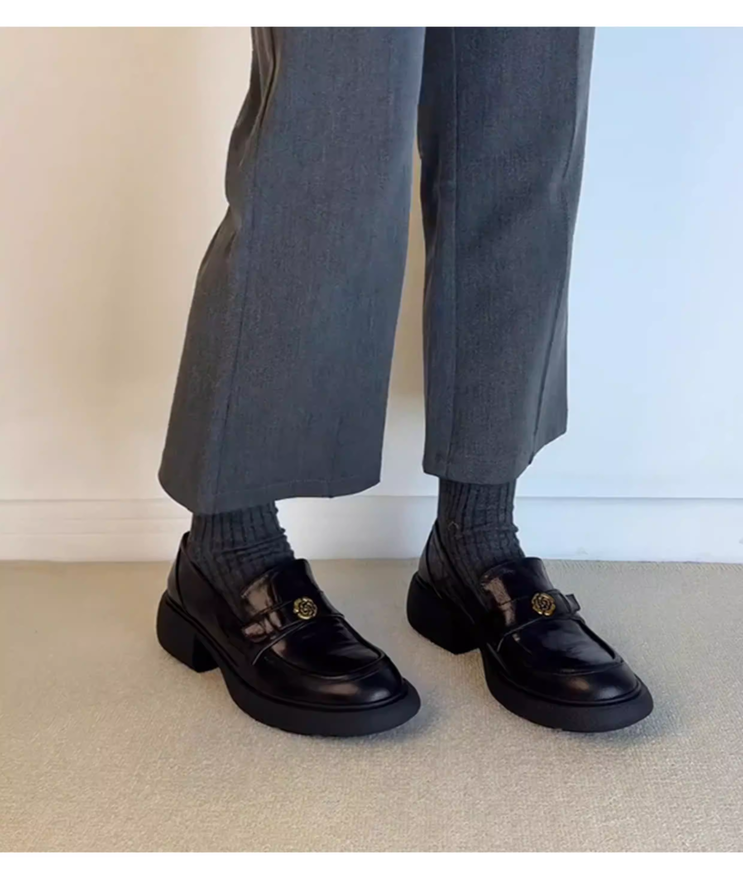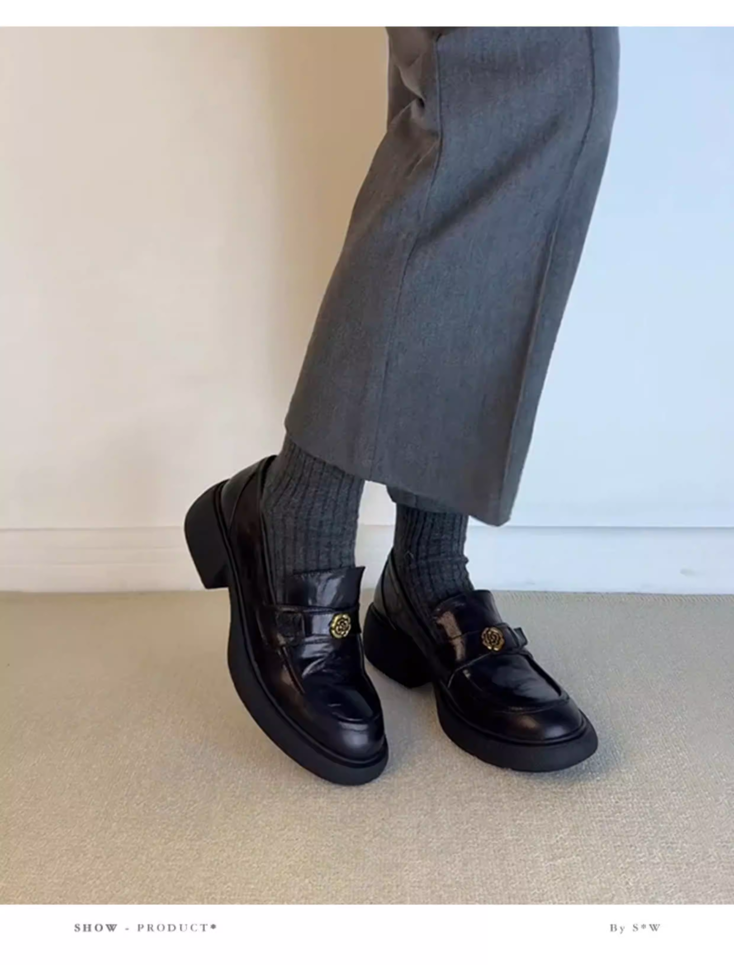 Phiên bản da cừu ~ Giày lười kiểu cổ điển hoa trà đa năng dành cho nữ với gót dày, giày da đế dày thoải mái để đi làm