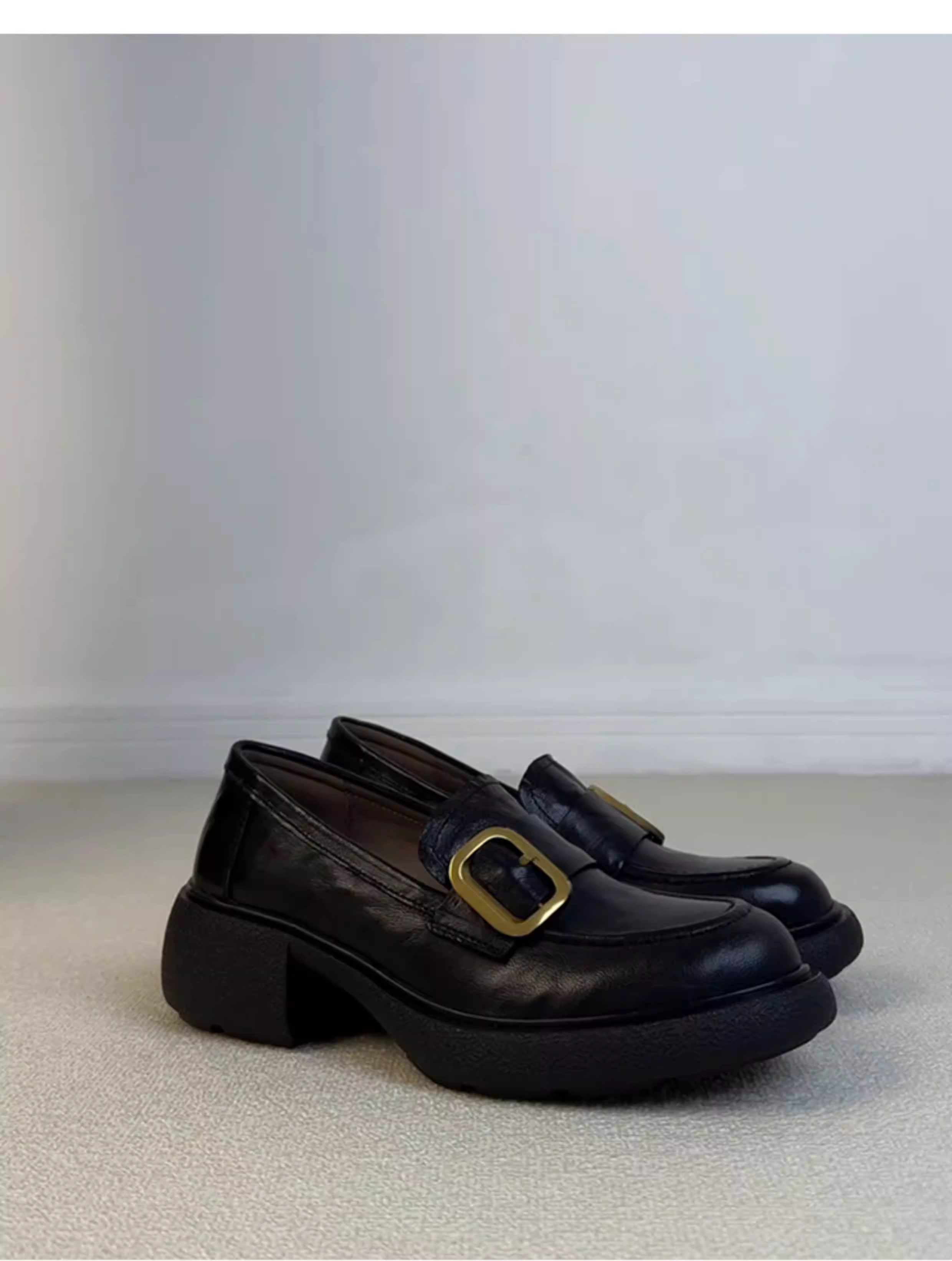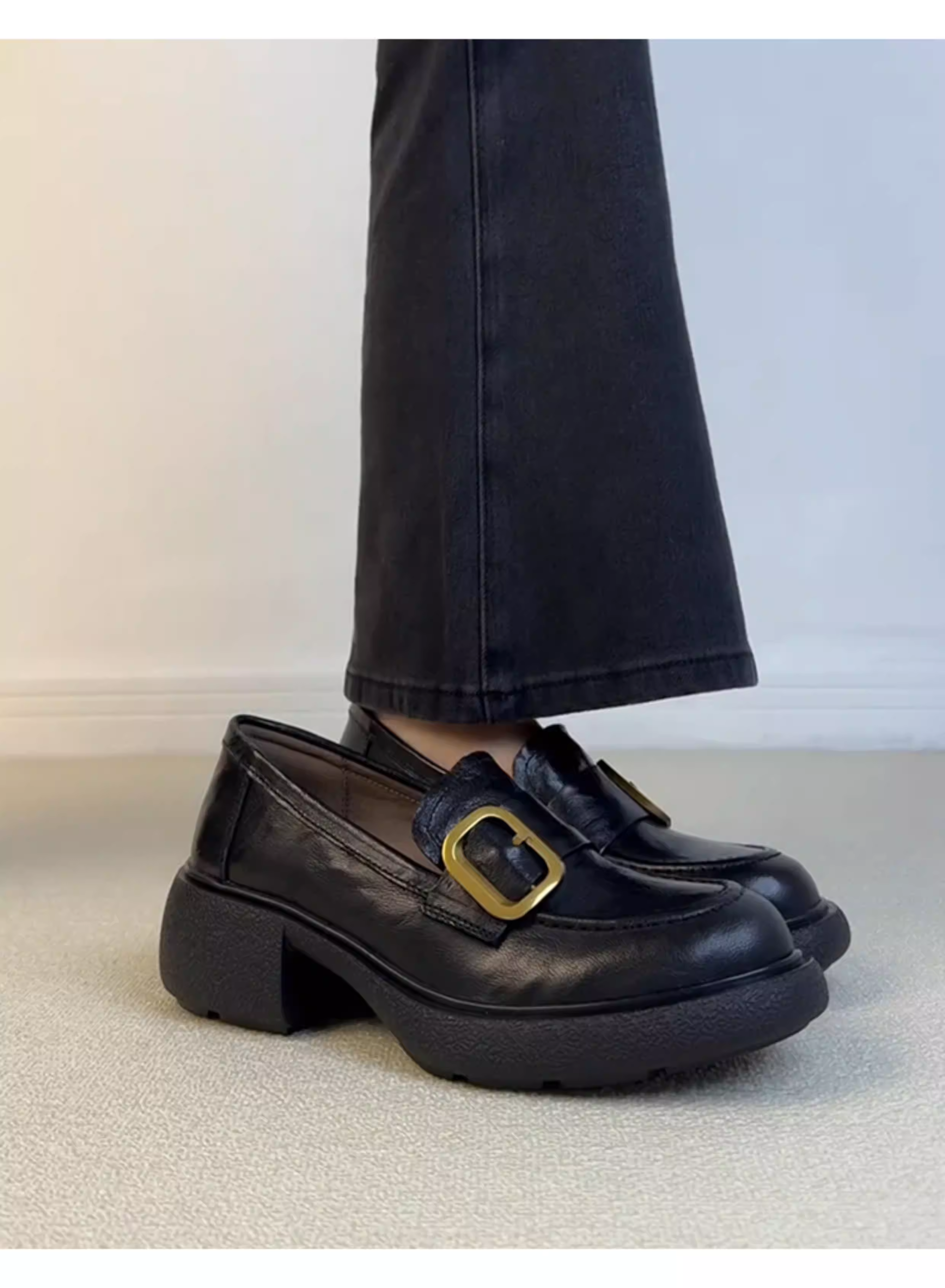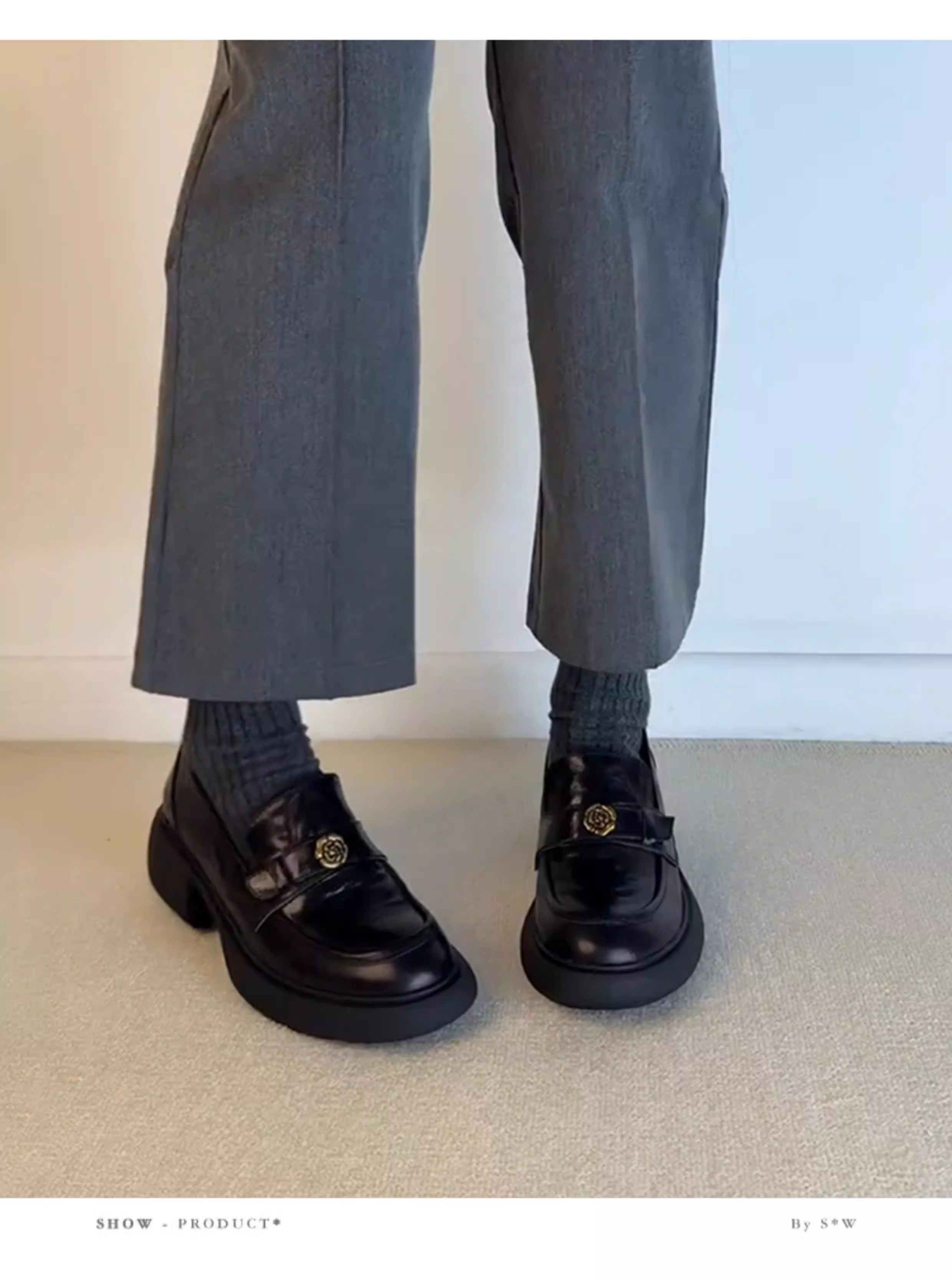 Phiên bản da cừu ~ Giày lười kiểu cổ điển hoa trà đa năng dành cho nữ với gót dày, giày da đế dày thoải mái để đi làm