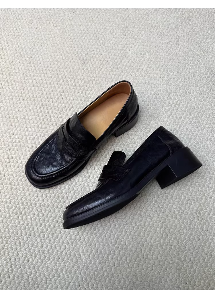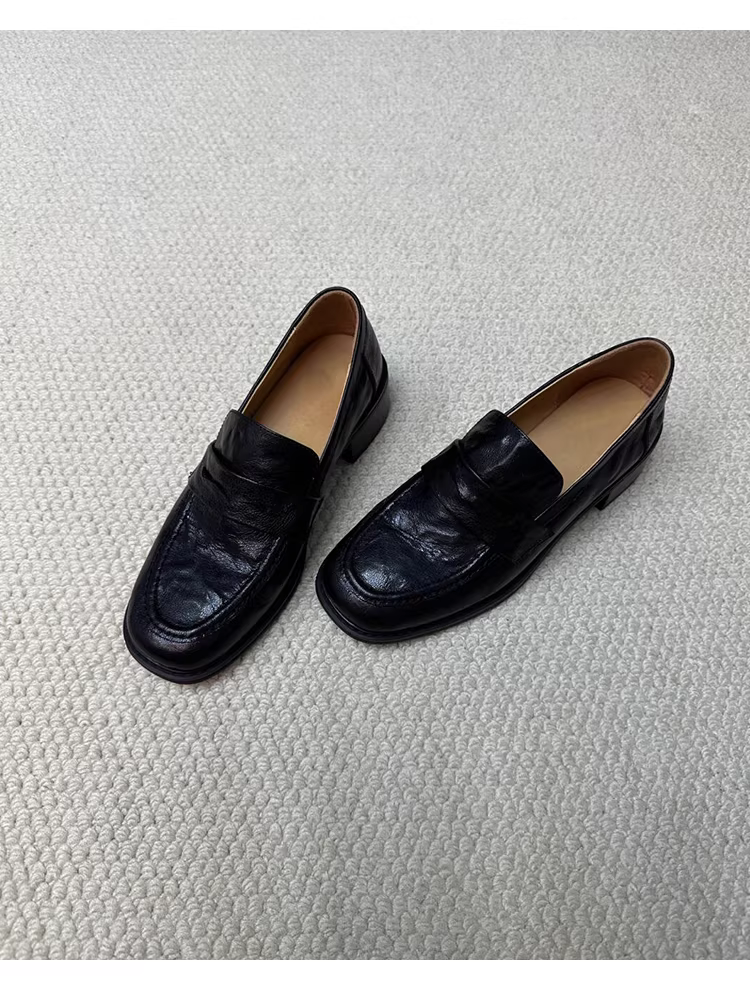 Phiên bản da cừu ~ Giày lười kiểu lười đi dành cho nữ, giày da thật màu đen cổ điển đơn giản, mũi vuông, gót dày, giày da nhỏ.