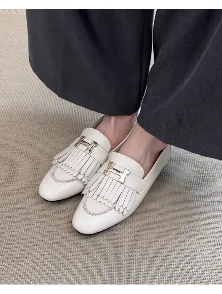 Phiên bản da cừu~ Giày lười màu trắng có khóa kim loại kiểu Pháp dành cho nữ, giày đế bằng để đi làm, giày da thật có tua rua.