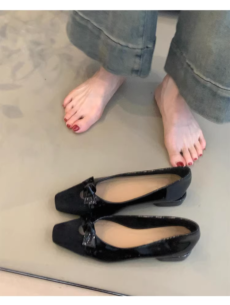 Phiên bản da cừu ~ Giày lười mũi vuông nông kiểu Pháp dành cho nữ, đa năng và dịu dàng, có nơ, gót dày, giày dạ hội bằng da thật.
