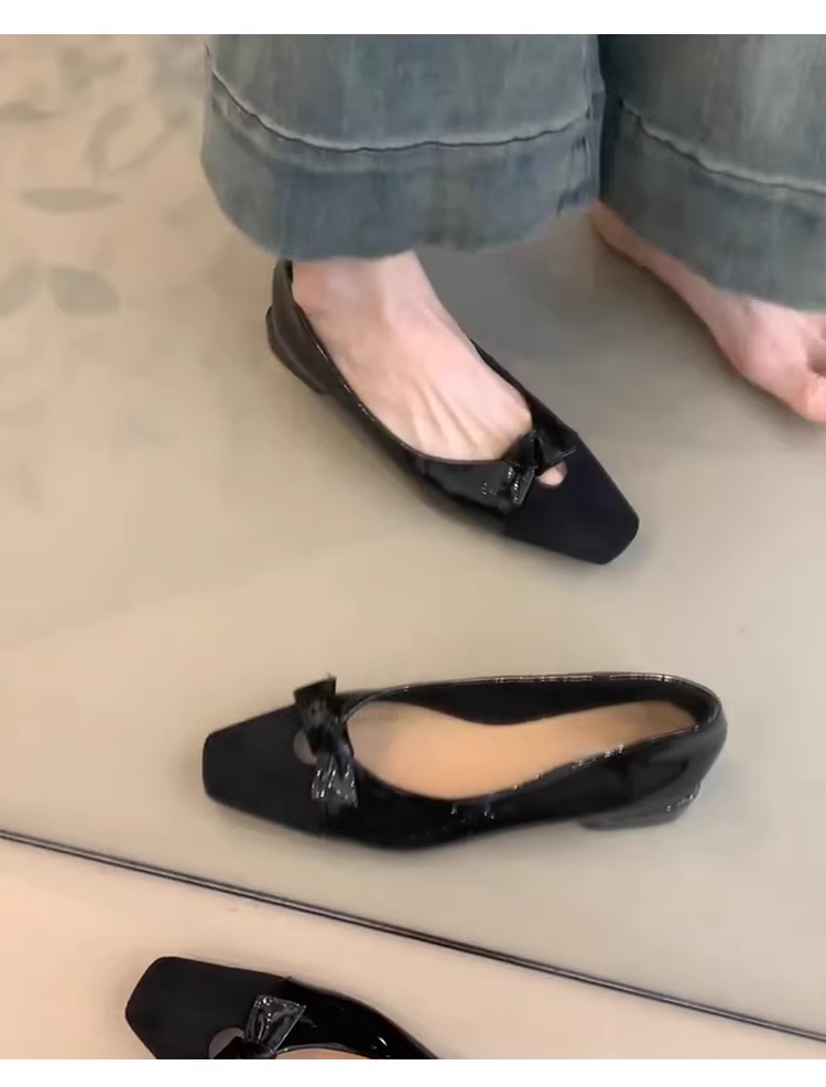 - Phiên bản da cừu ~ Giày lười mũi vuông nông kiểu Pháp dành cho nữ, đa năng và dịu dàng, có nơ, gót dày, giày dạ hội bằng da thật.