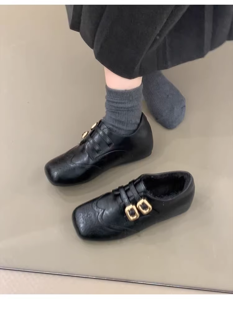 - Phiên bản da cừu ~ Giày lười nữ có lót nhung, có khóa thắt lưng, gót giấu, giày da nhỏ đa năng, giày đơn kiểu brogue kiểu Anh.