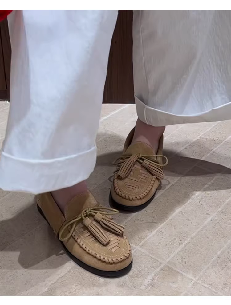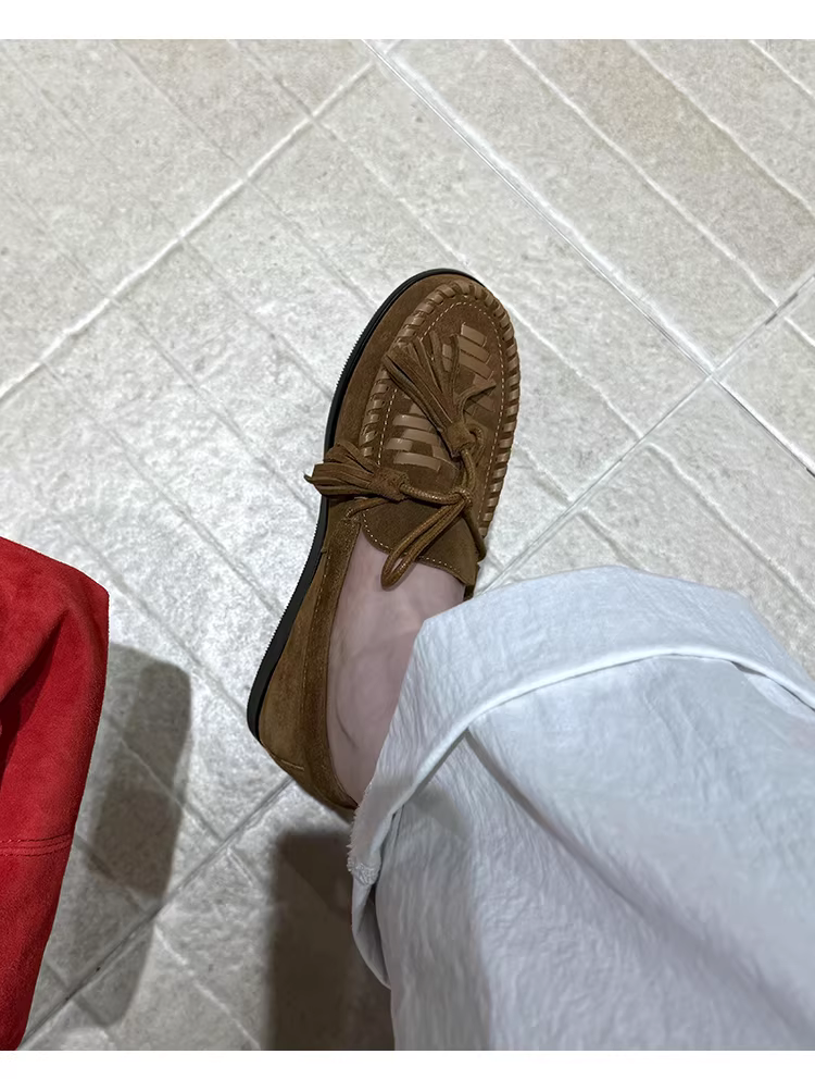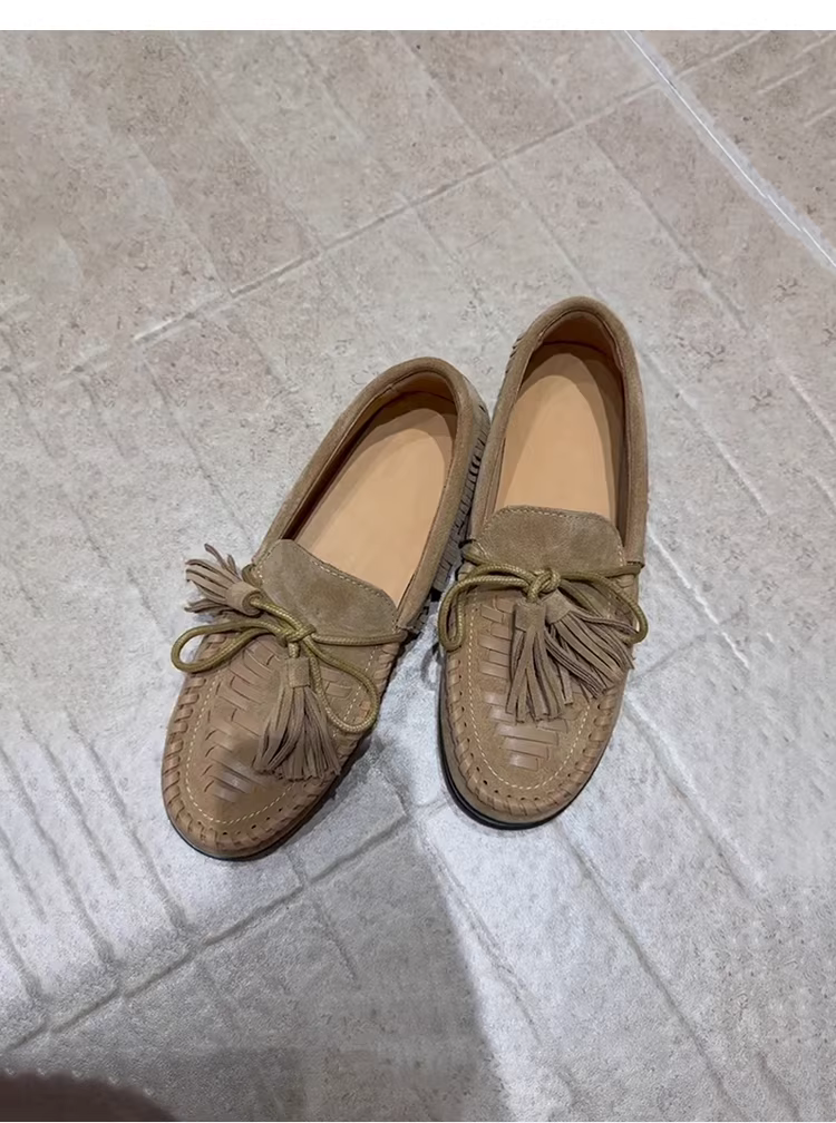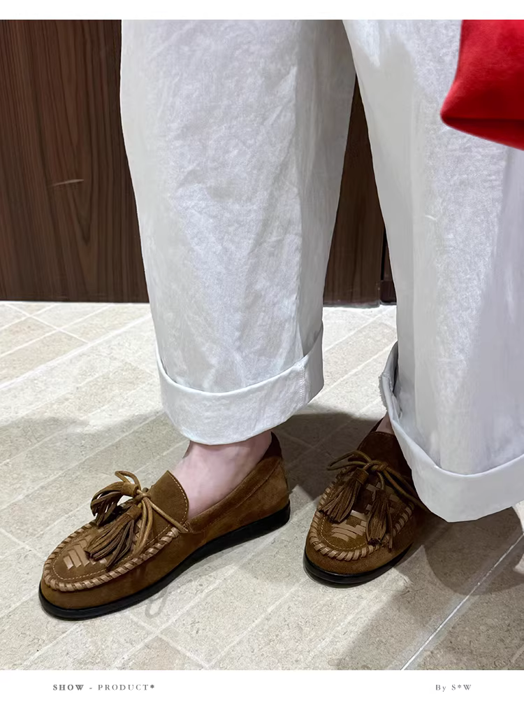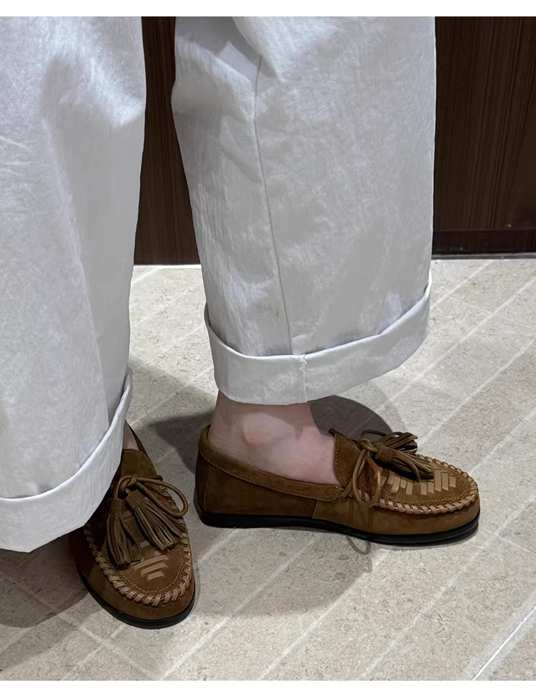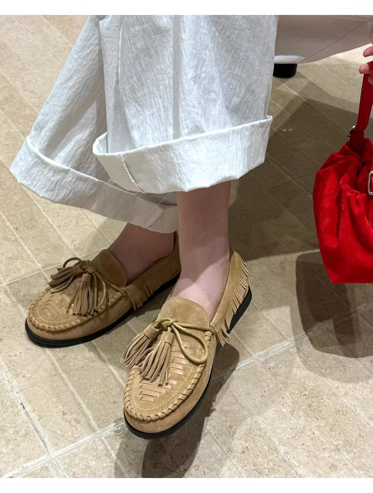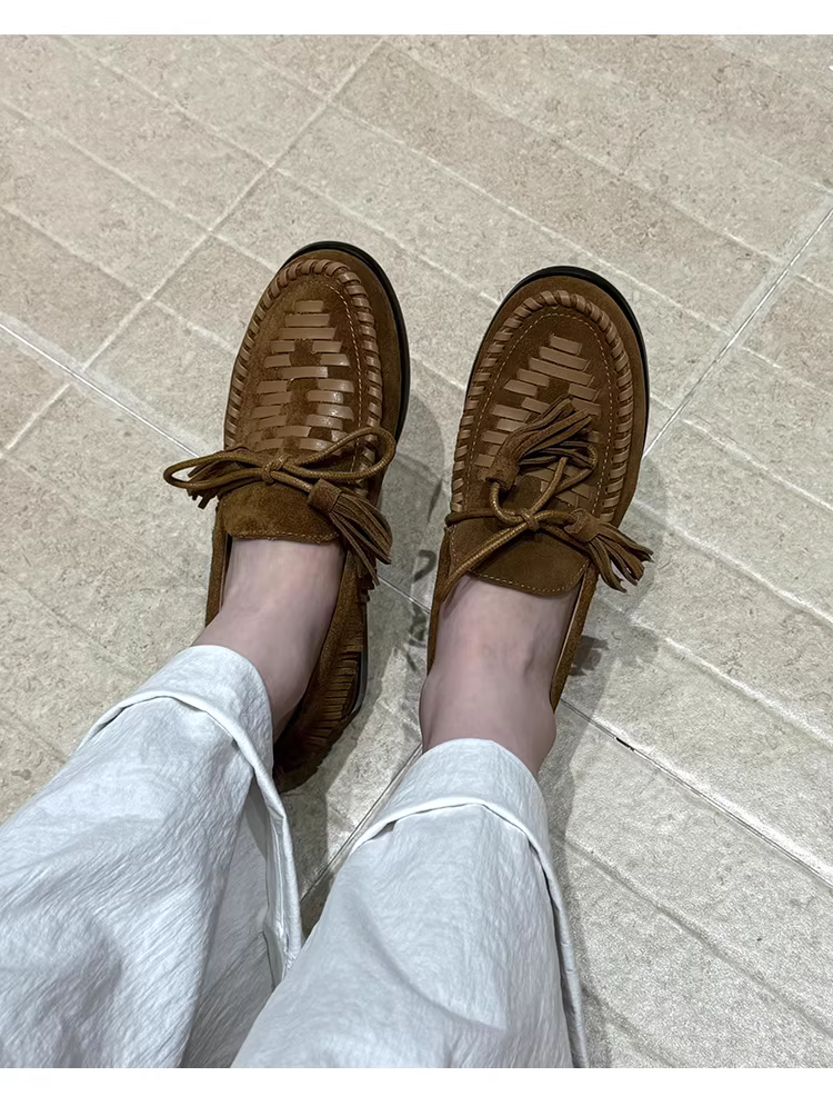 Phiên bản da cừu ~ Giày lười tua rua dệt theo phong cách đất hoang dành cho nữ, giày da lộn đế bằng kiểu mới, kiểu dáng dễ mang