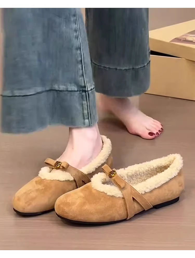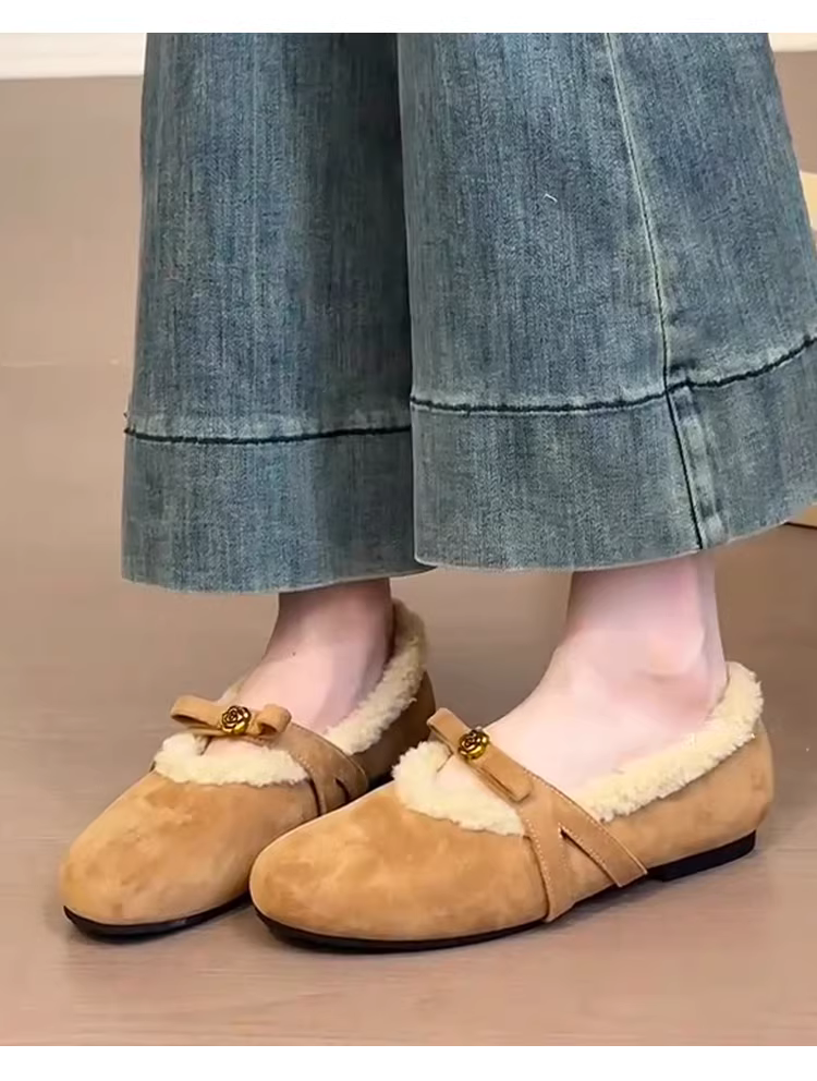 Phiên bản da cừu ~ Giày Mary Jane có nơ hoa trà nhẹ nhàng dành cho nữ, miệng nông, lót lông cừu, giày lông đế phẳng