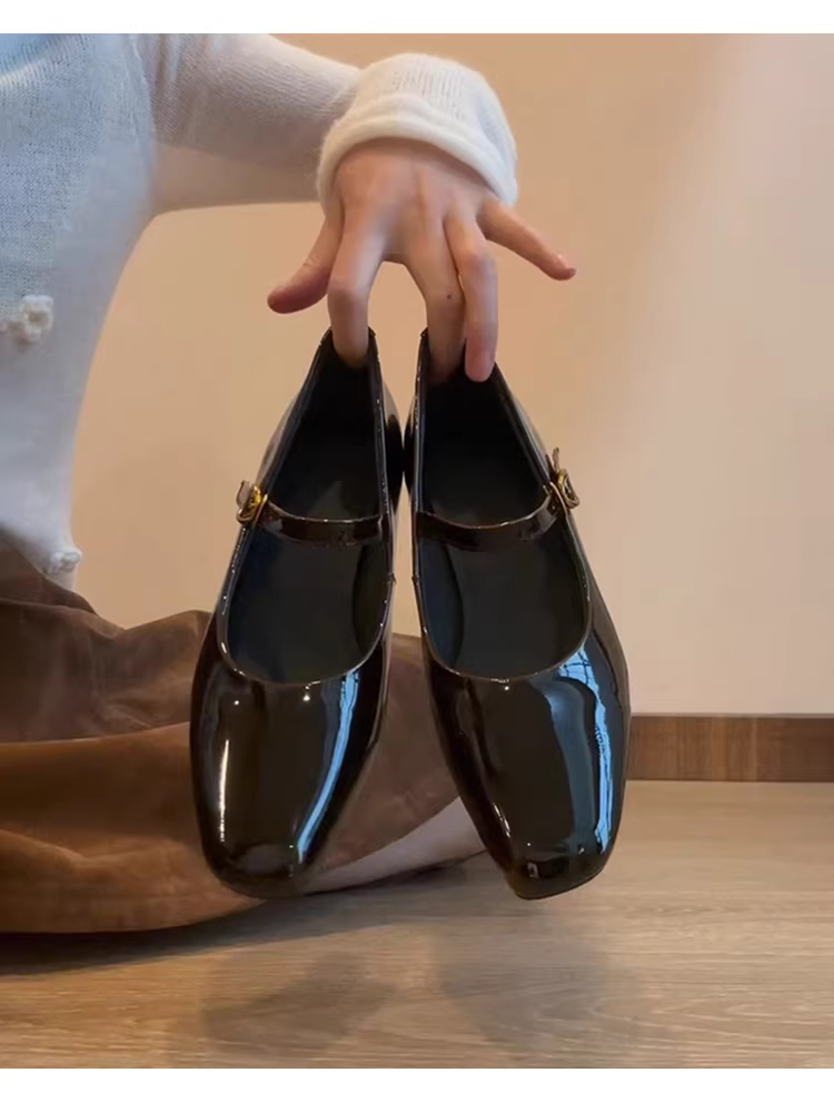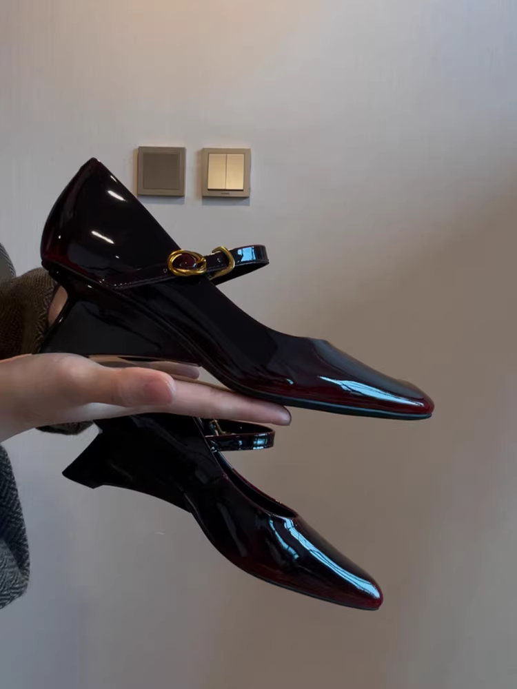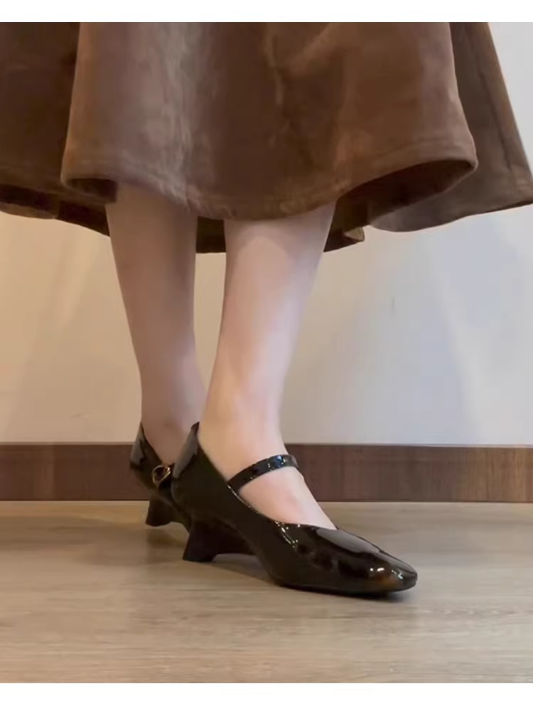 Phiên bản da cừu ~ Giày Mary Jane màu hổ phách mới dành cho nữ, quai đơn, gót wedge, mũi vuông, giày da nhỏ, giày cao gót da thật
