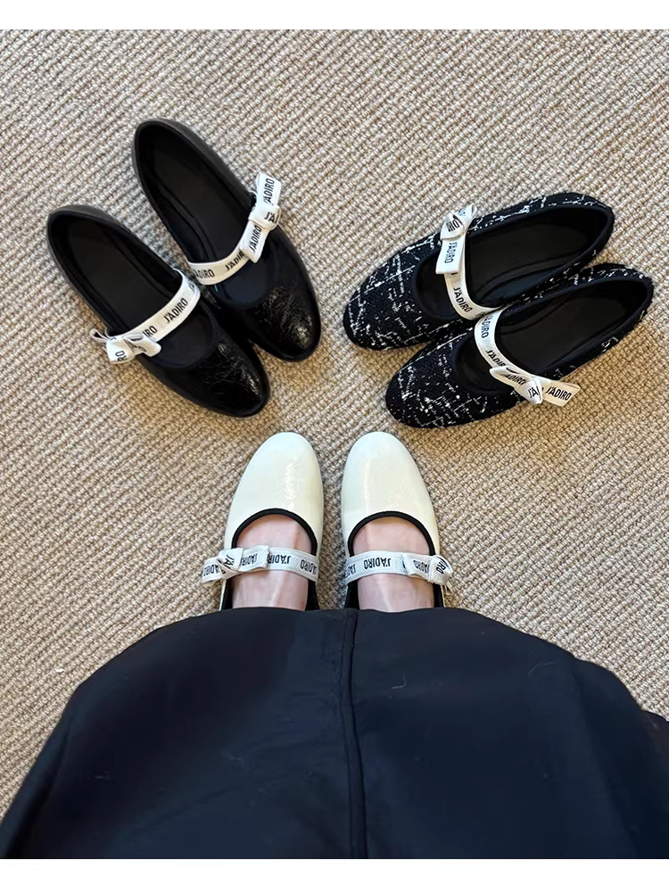 Phiên bản da cừu ~ Giày Mary Jane miệng nông kiểu Chanel dành cho nữ có nơ, mũi tròn, đế phẳng, giày đơn đa năng