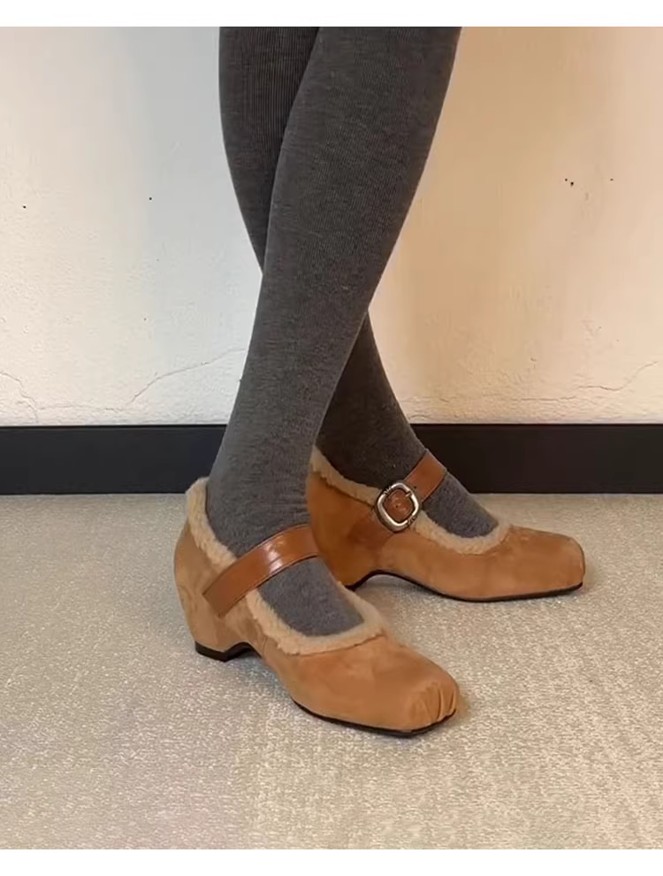 Phiên bản da cừu ~ Giày Mary Jane mũi heo kiểu múa ba lê Pháp thanh lịch dành cho nữ, có khóa, nâng gót giấu kín và lót lông cừu.