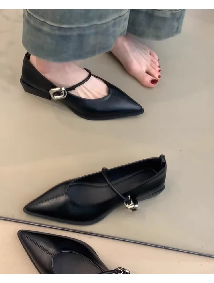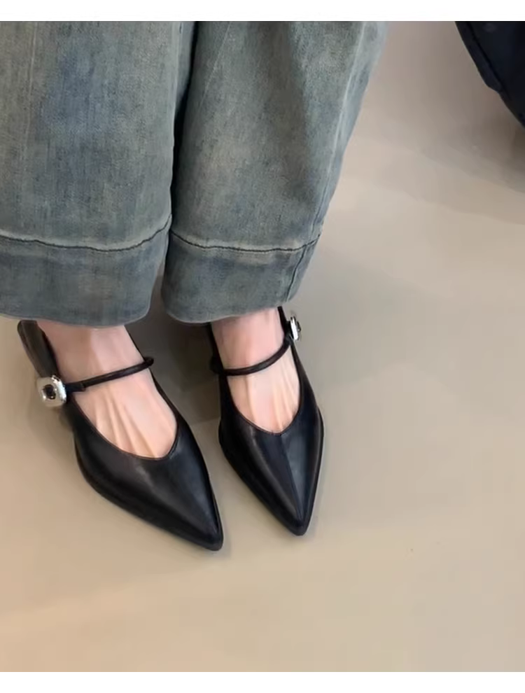 Phiên bản da cừu ~ Giày Mary Jane mũi nhọn kiểu cổ điển dành cho nữ có khóa, giày đế thấp bằng da thật có gót dày.