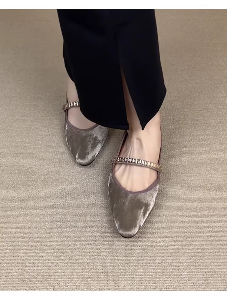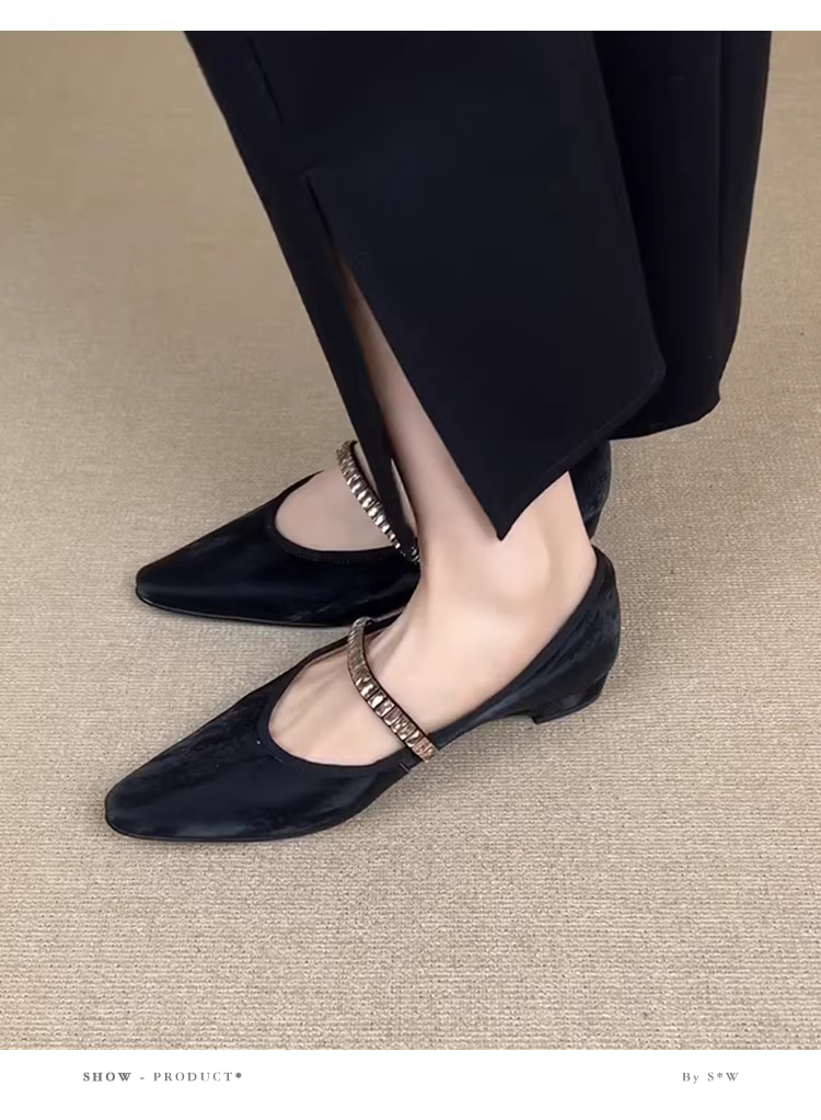 - Phiên bản da cừu ~ Giày Mary Jane quai đính đá mũi nhọn nông kiểu Pháp dành cho nữ, giày da thật đế bằng kiểu Trung Quốc mới.