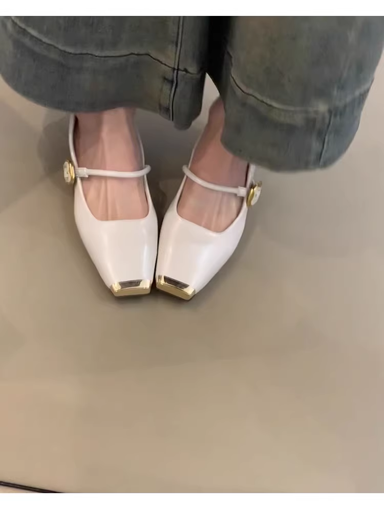Phiên bản da cừu ~ Giày nữ đế bằng mũi vuông bằng kim loại, thoải mái, kiểu dáng cổ điển, đa năng, quai đơn, miệng nông, da thật, kiểu Mary Jane