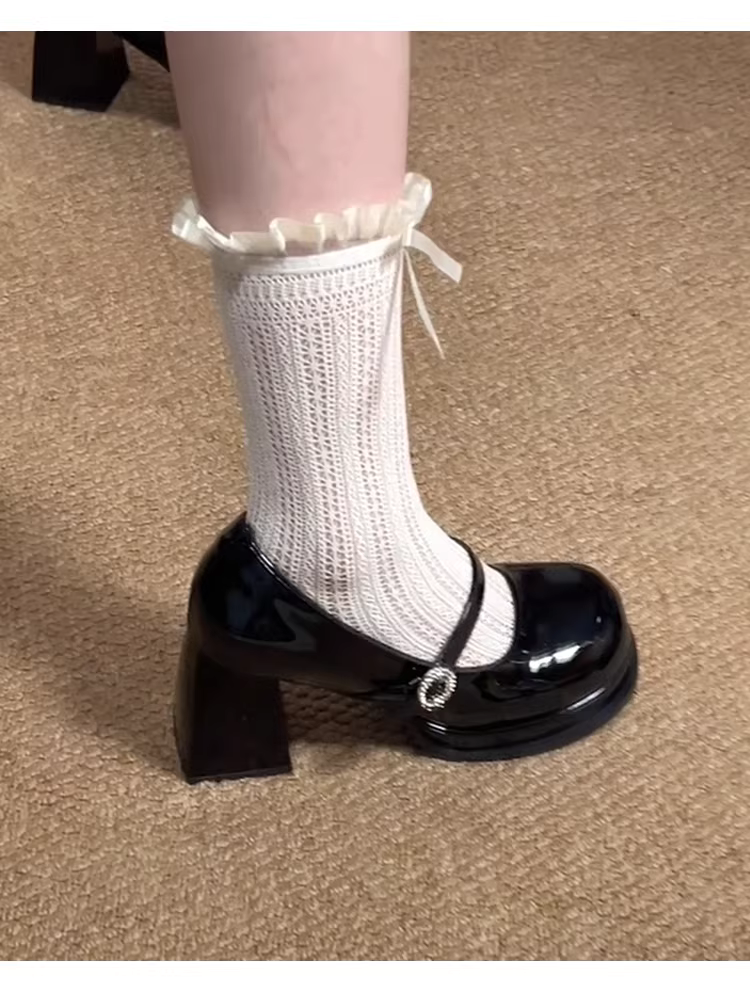 - Phiên bản da cừu ~ Giày nữ Mary Jane cao gót nhỏ nhắn bằng da bóng kiểu Pháp, miệng giày nông, quai đơn có khóa, đế bệt gót thô.