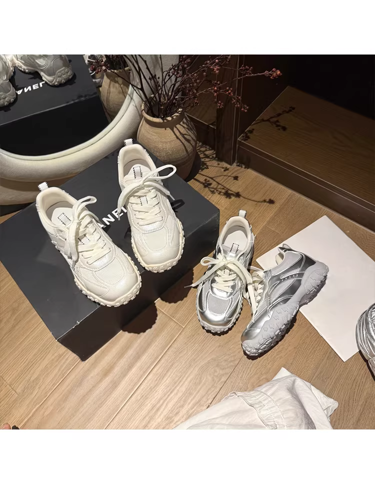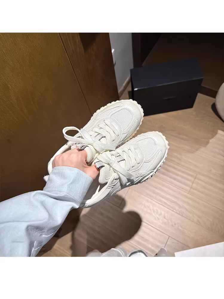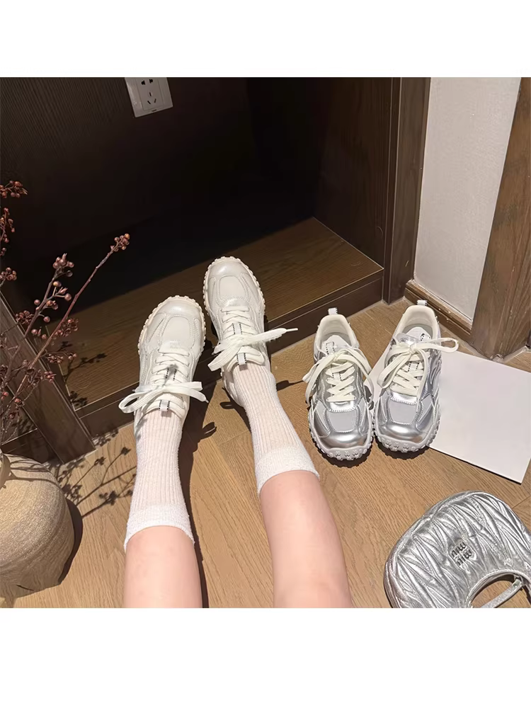 Phiên bản da cừu ~ Giày thể thao đế dày tăng chiều cao đa năng dành cho nữ, giày bố thời trang da thật buộc dây mới