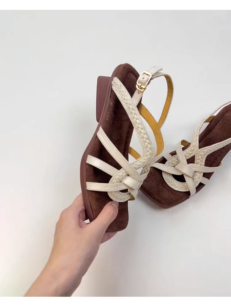 Phiên bản da cừu ~ Thiết kế độc đáo kiểu retro, dép La Mã mũi vuông, đế rỗng, dệt thoáng khí, thời trang, chất liệu da thật, đa năng