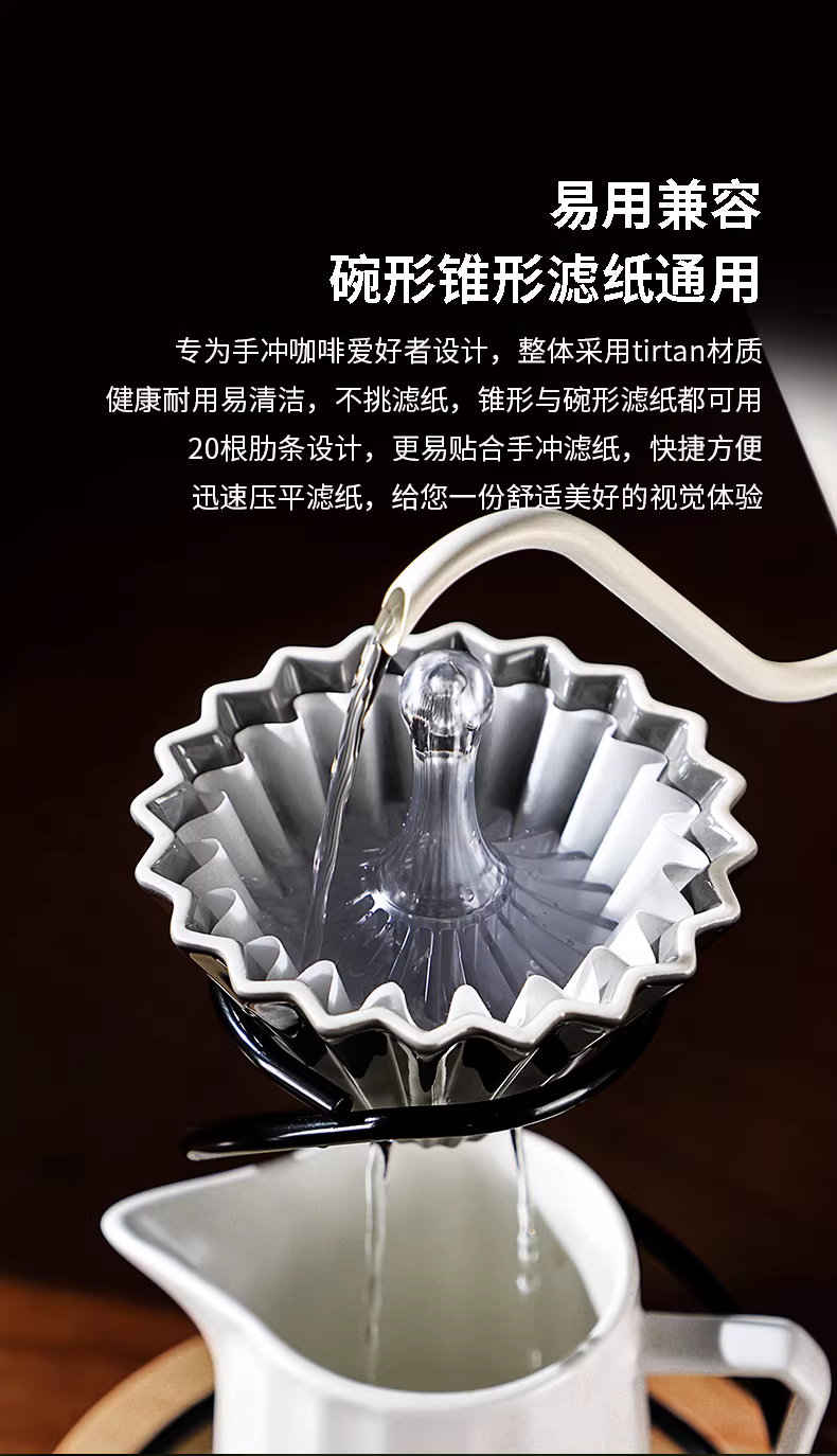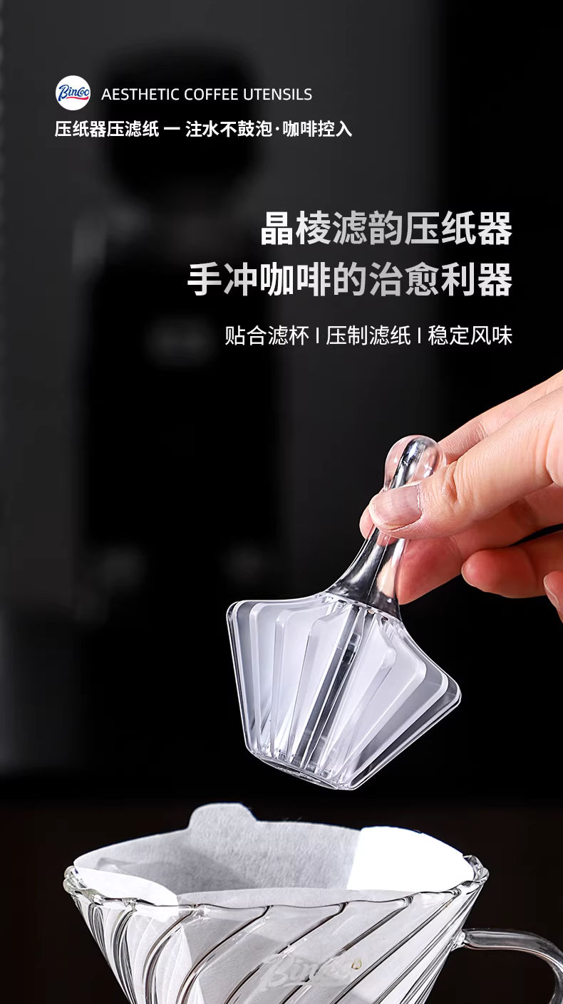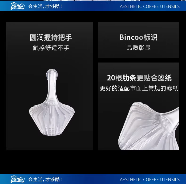 Phin pha cà phê Bin Coo Coffee Tritan kiểu Pour-over V60, giấy lọc hình nón Origami, giấy lọc dạng bánh, sử dụng máy ép nhựa.
