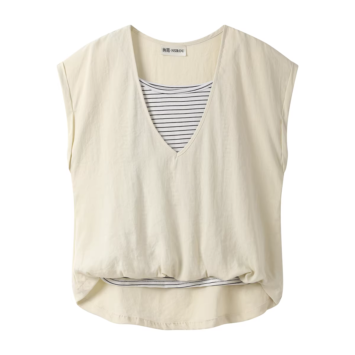 - Phong cách Hàn Quốc, thiết kế đơn giản và độc đáo, áo thun không tay cổ chữ V, phong cách mới mùa hè dành cho nữ, áo ngắn giả hai mảnh.