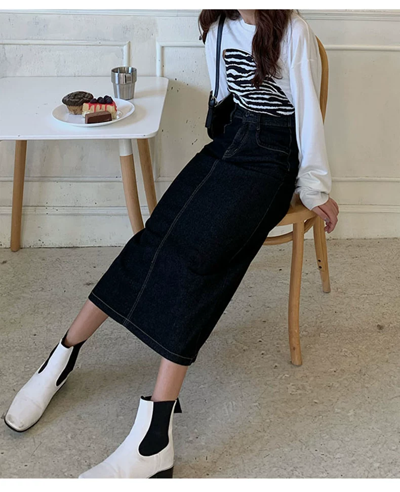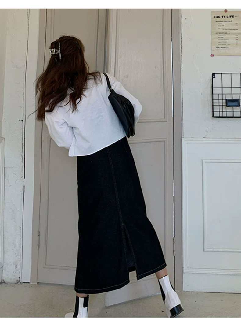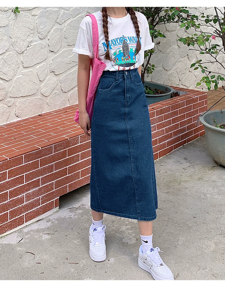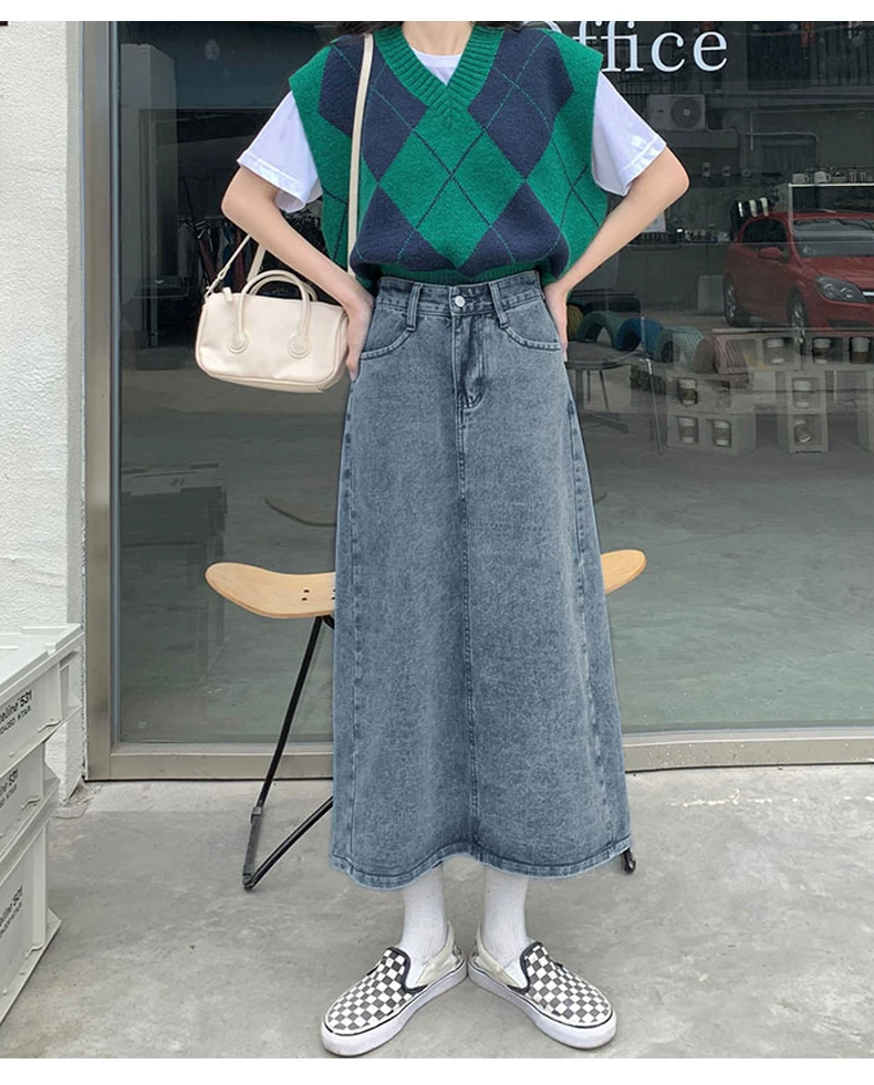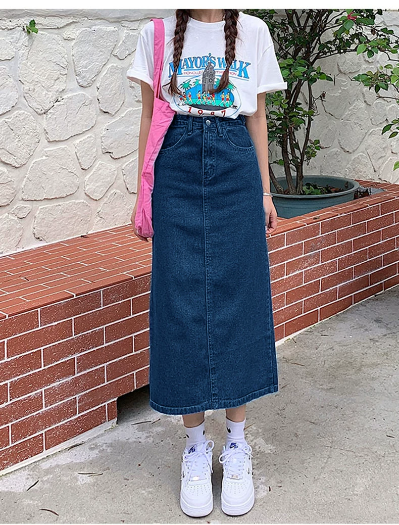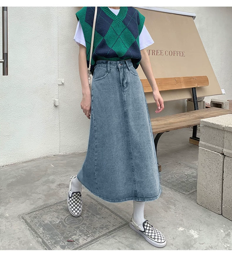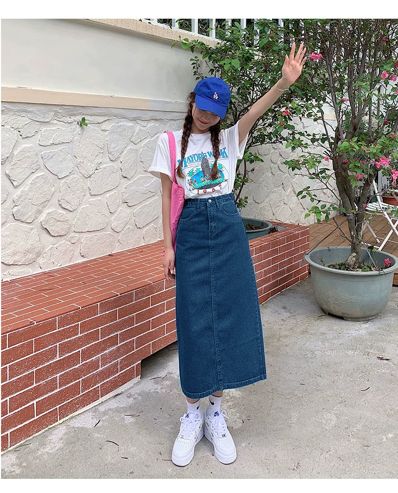 - Phong cách mới mùa hè dành cho phụ nữ hơi mũm mĩm, dáng quả lê, che hông, giảm béo, váy denim chữ A dài vừa phải, cạp cao