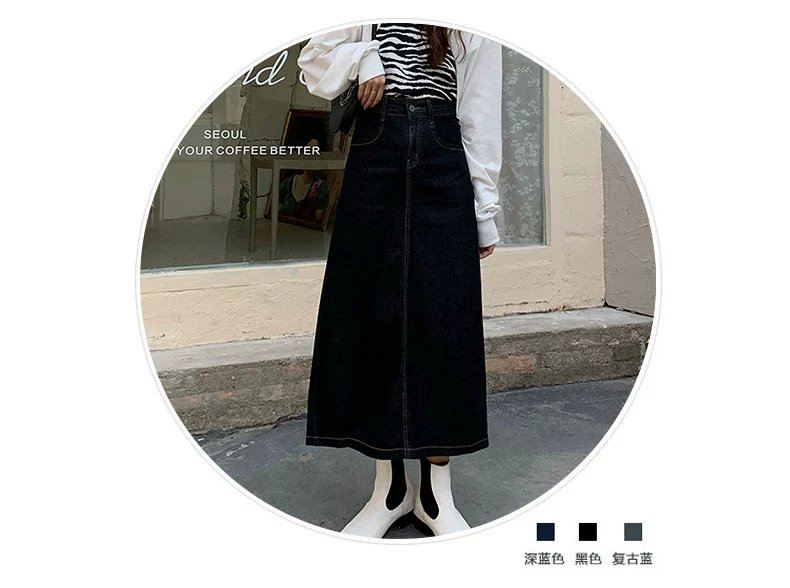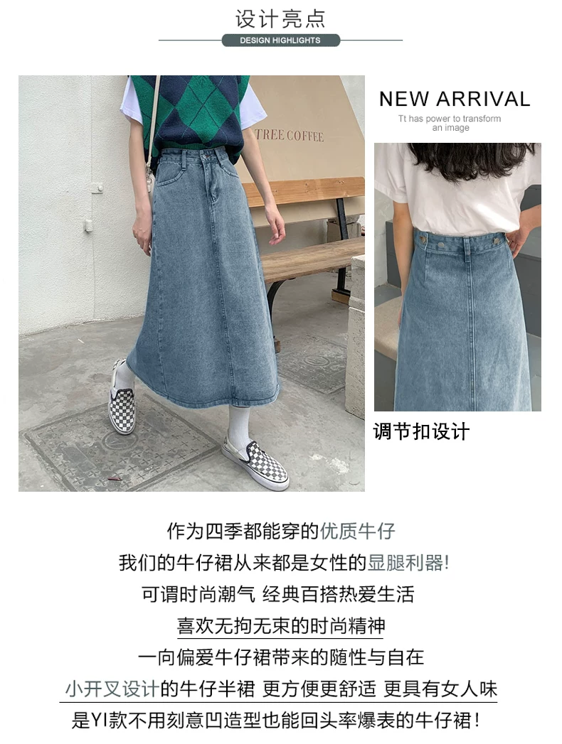 Phong cách mới mùa hè dành cho phụ nữ hơi mũm mĩm, dáng quả lê, che hông, giảm béo, váy denim chữ A dài vừa phải, cạp cao