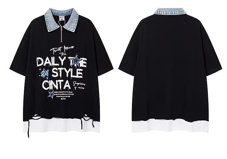Phong cách từ sao Hỏa là đa năng, phong cách đường phố, áo thun denim cổ polo giả hai mảnh, dáng rộng, tay ngắn, hợp thời trang