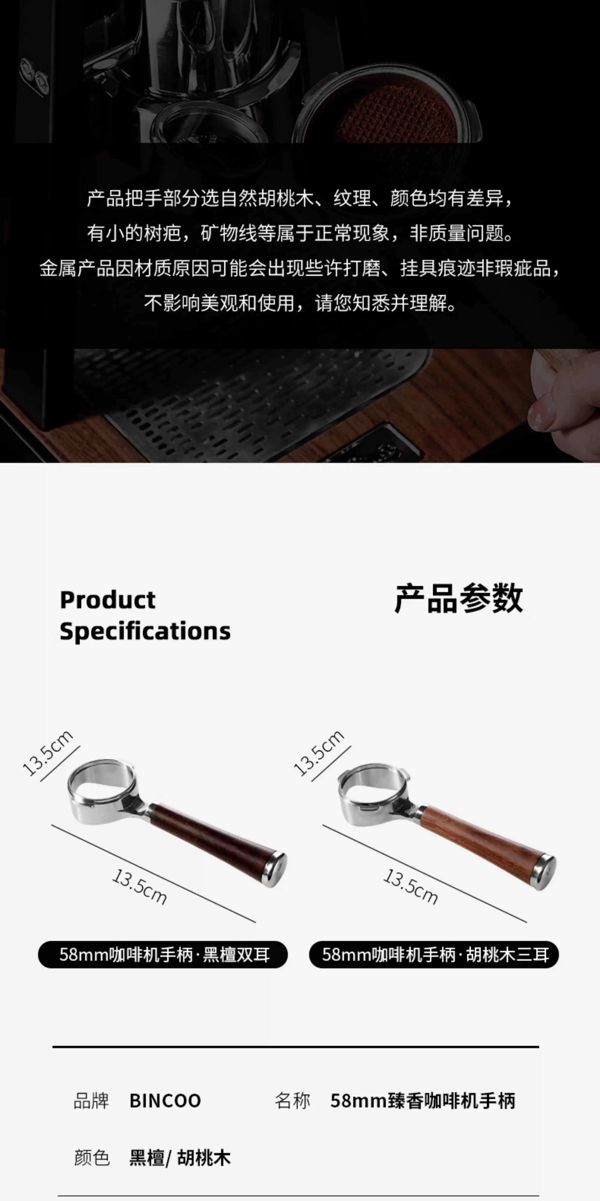 - Phụ kiện máy pha cà phê Bincoo, bộ lọc cà phê không đáy 51/58mm, tay cầm gỗ óc chó