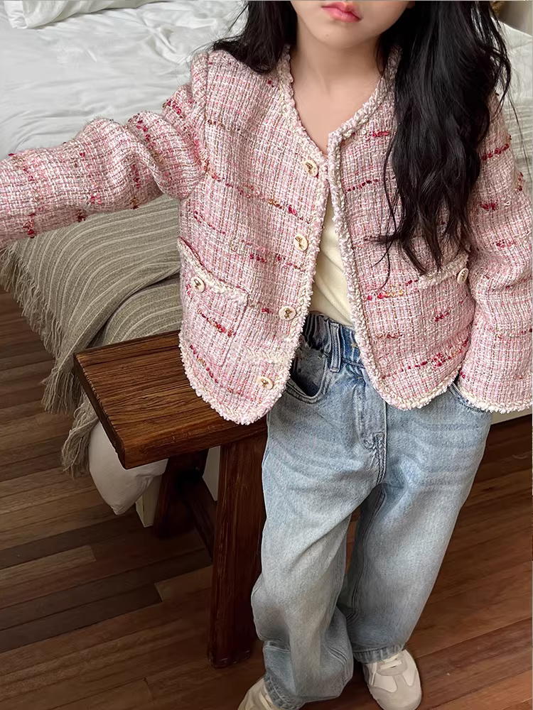 Quần áo bé gái Hàn Quốc xuân thu 2025, áo kiểu thời thượng trẻ em, áo khoác phong cách Chanel dễ thương cho trẻ lớn, trang phục mẹ và bé