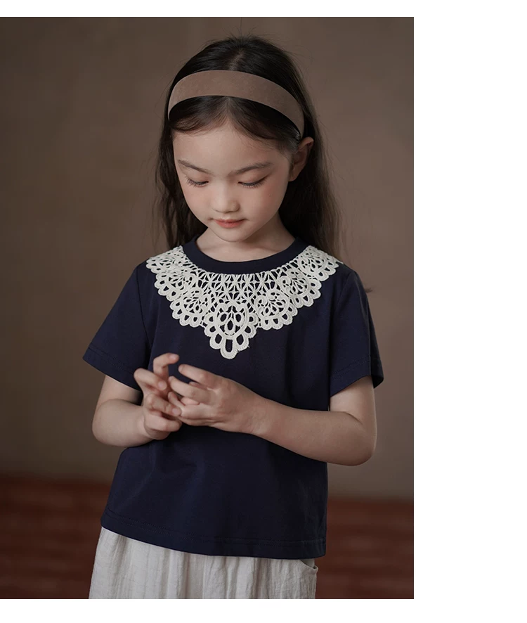 - Quần áo mùa hè trẻ em 25 kiểu mới áo len dệt kim áo thun ngắn tay bé gái cổ ren áo kiểu giản dị mùa hè mỏng nhẹ