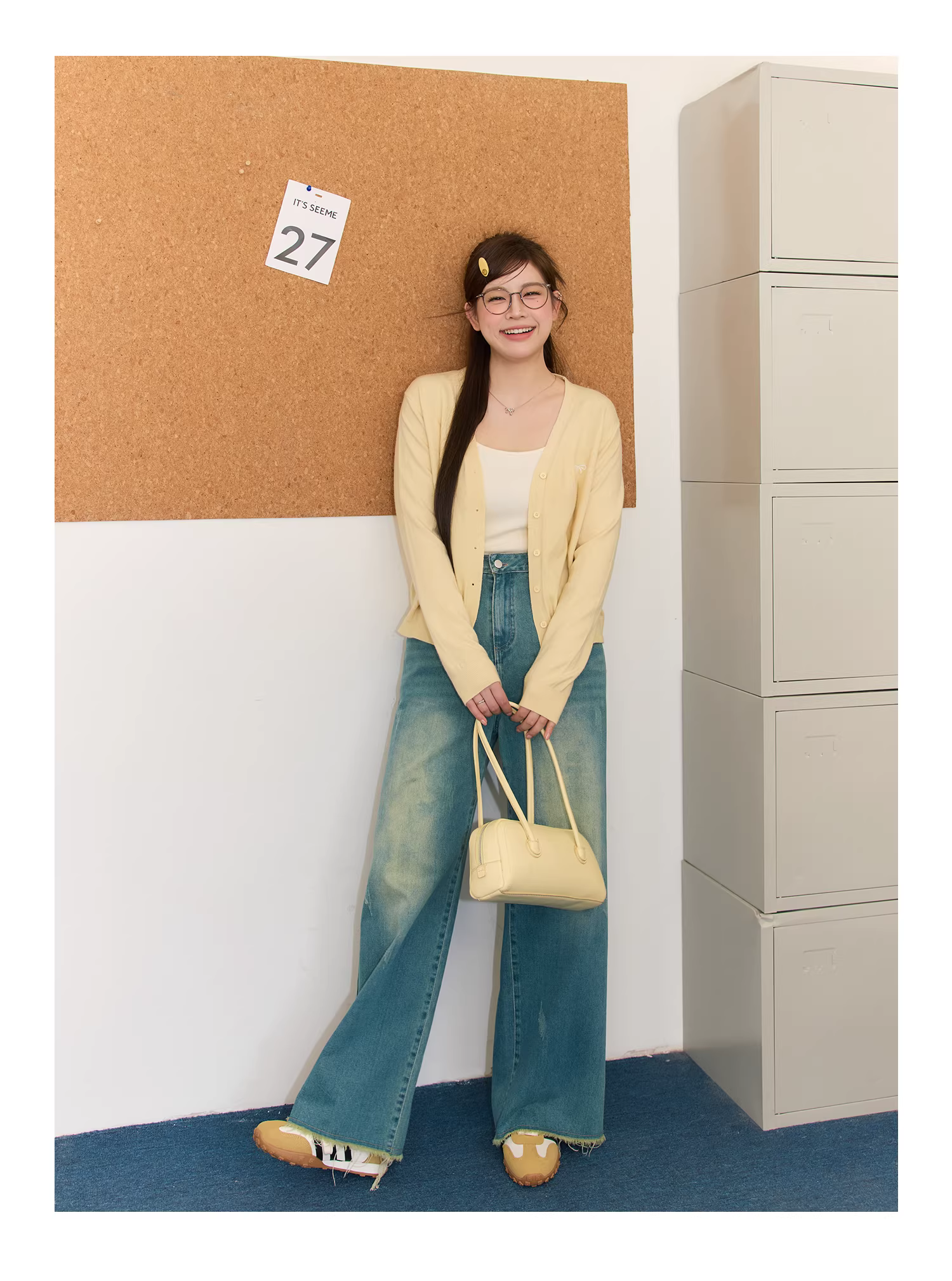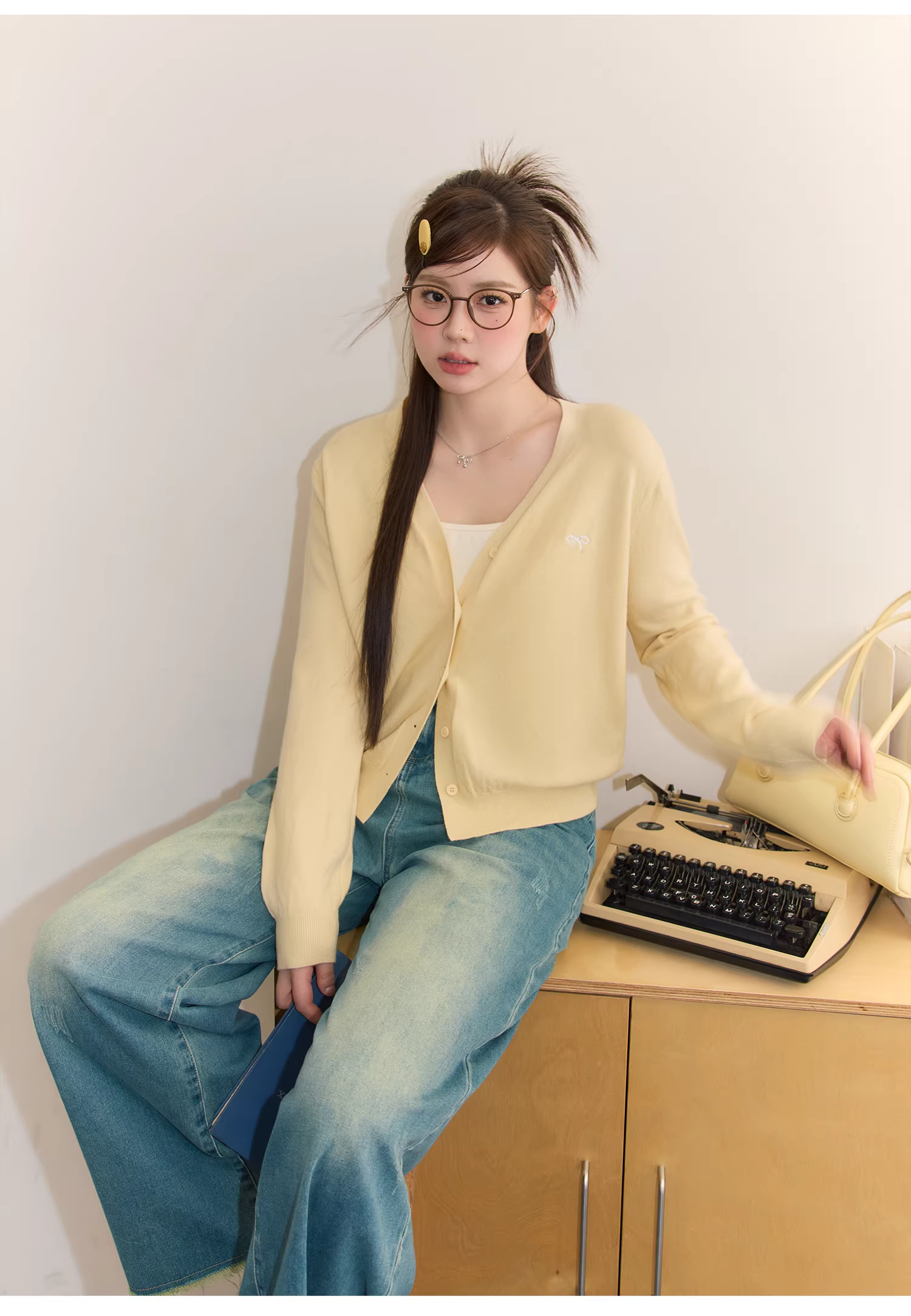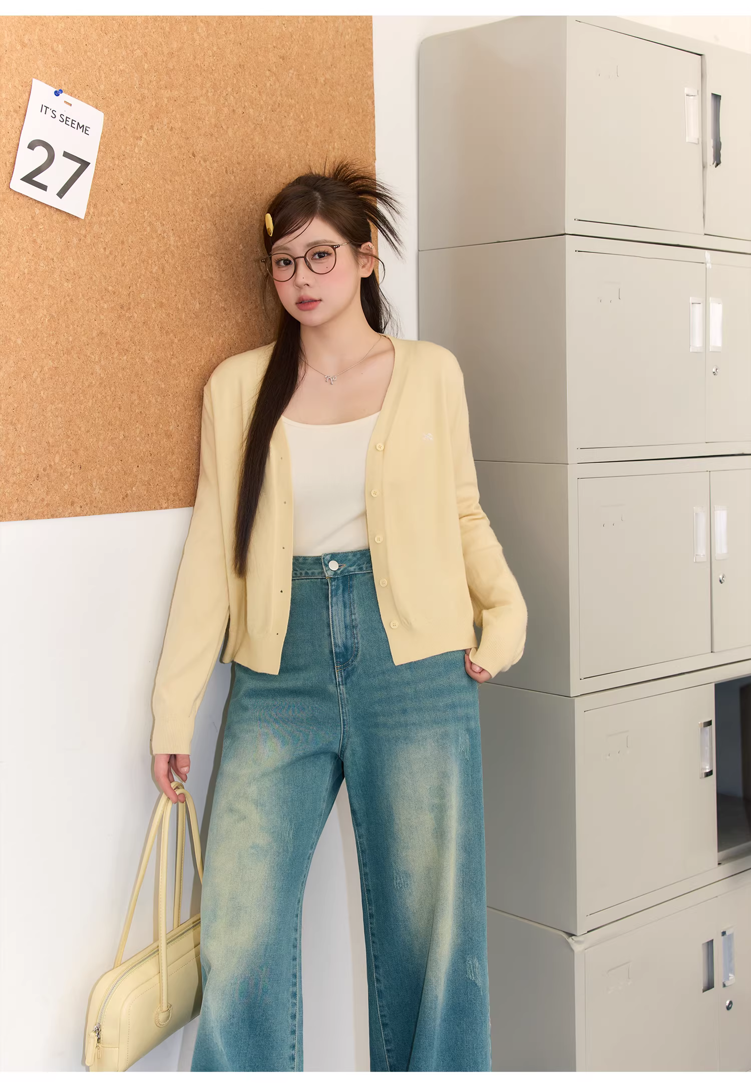 - Quần áo mùa xuân cỡ lớn dành cho nữ, kiểu dáng đa dạng, bộ áo len màu vàng sữa và quần jean tôn dáng.