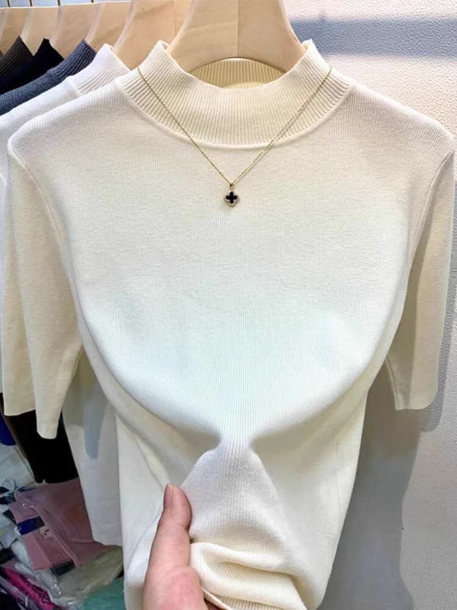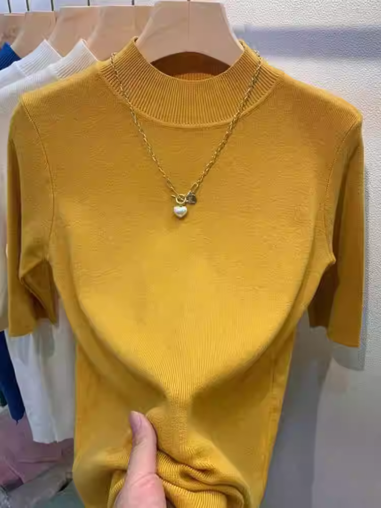- Quần áo nữ châu Âu giảm giá có thương hiệu, áo sơ mi cổ cao nửa cổ có nhãn cắt, lớp bên trong có áo dệt kim tay giữa, áo len ôm dáng thon gọn.