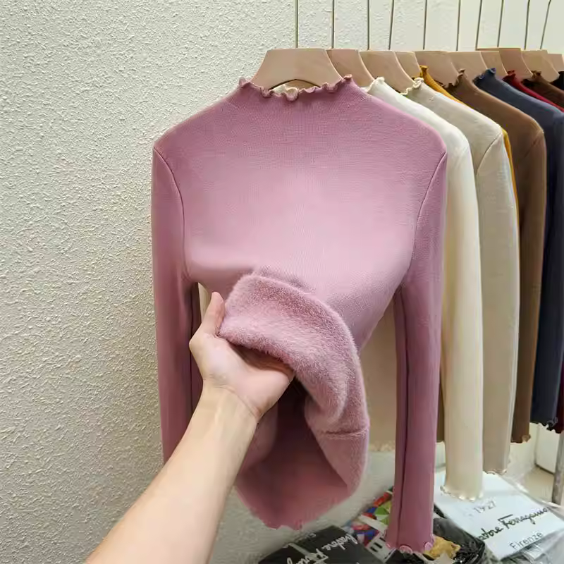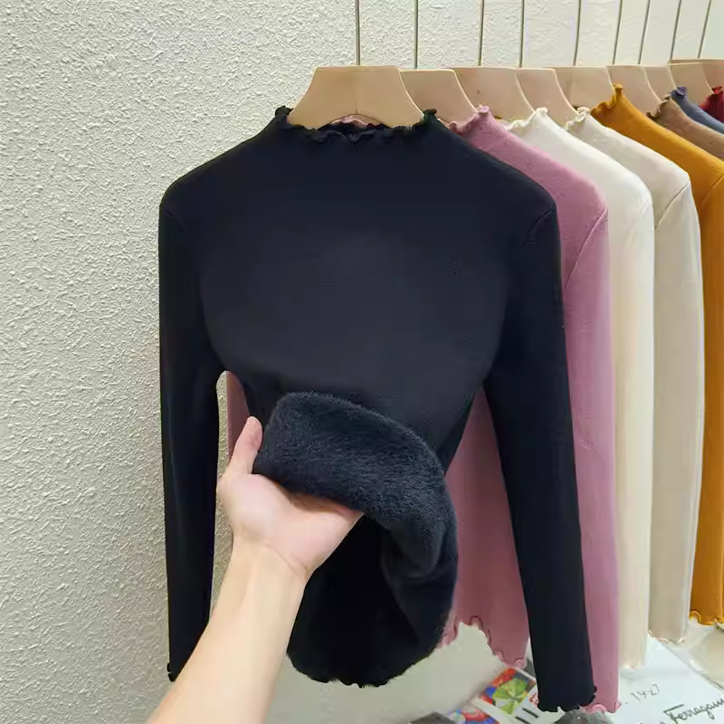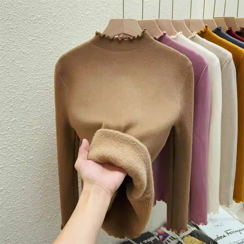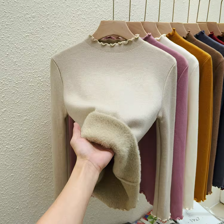 Quần áo nữ châu Âu giảm giá có thương hiệu, cổ cao nửa cổ có viền xếp nếp, lớp lót bên trong bằng lông cừu tích hợp, dày dặn để giữ ấm, áo len bên trong.