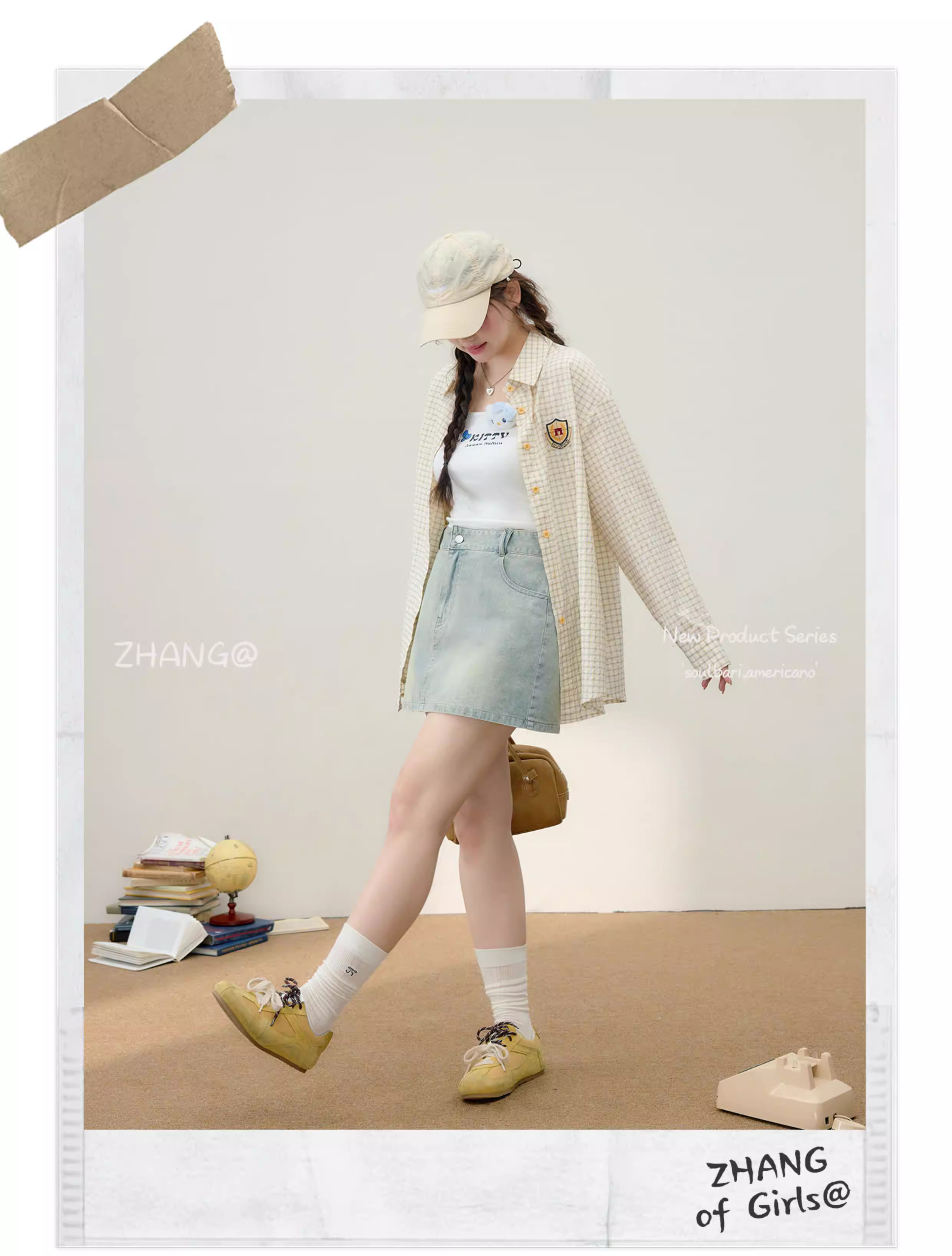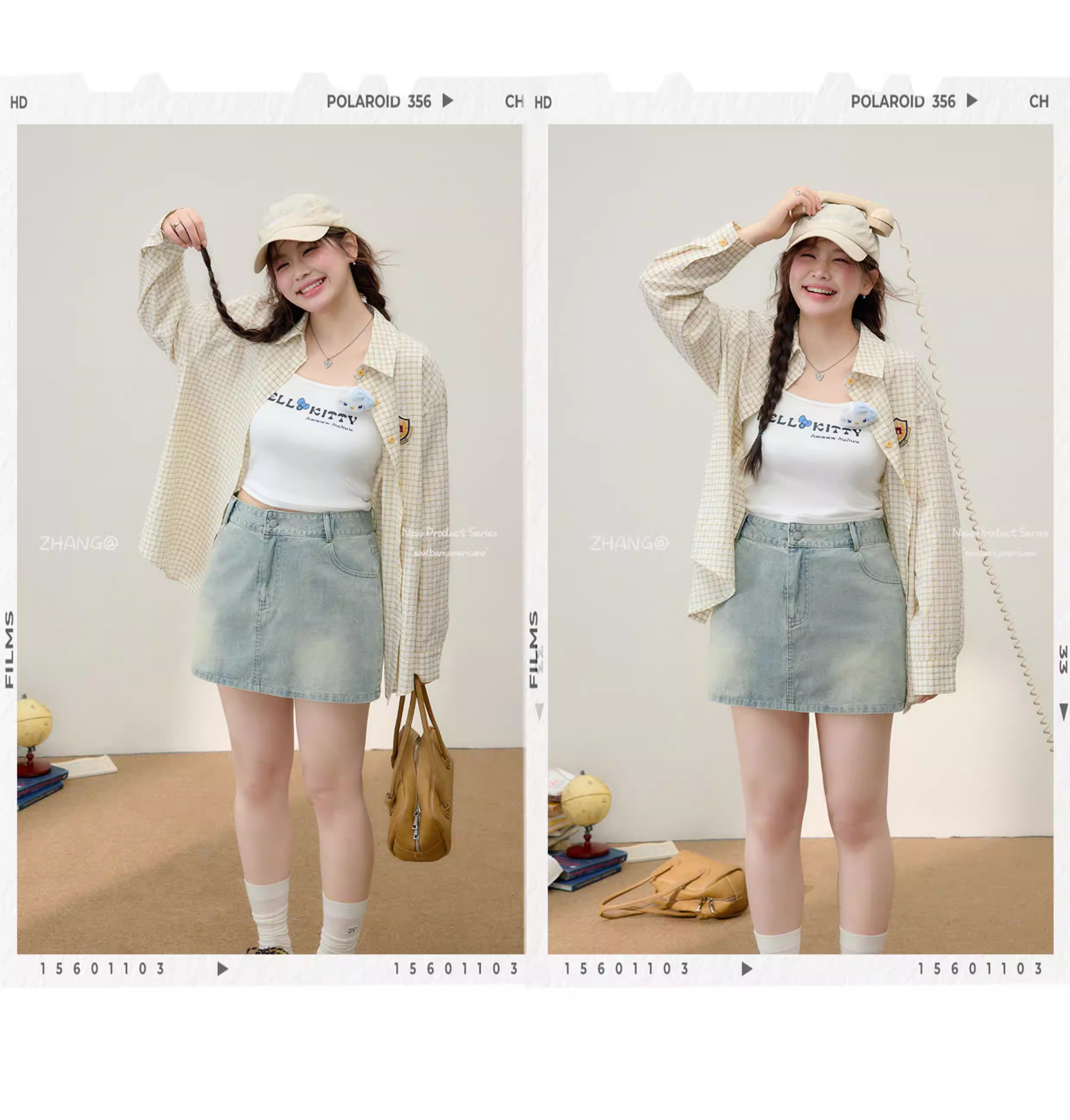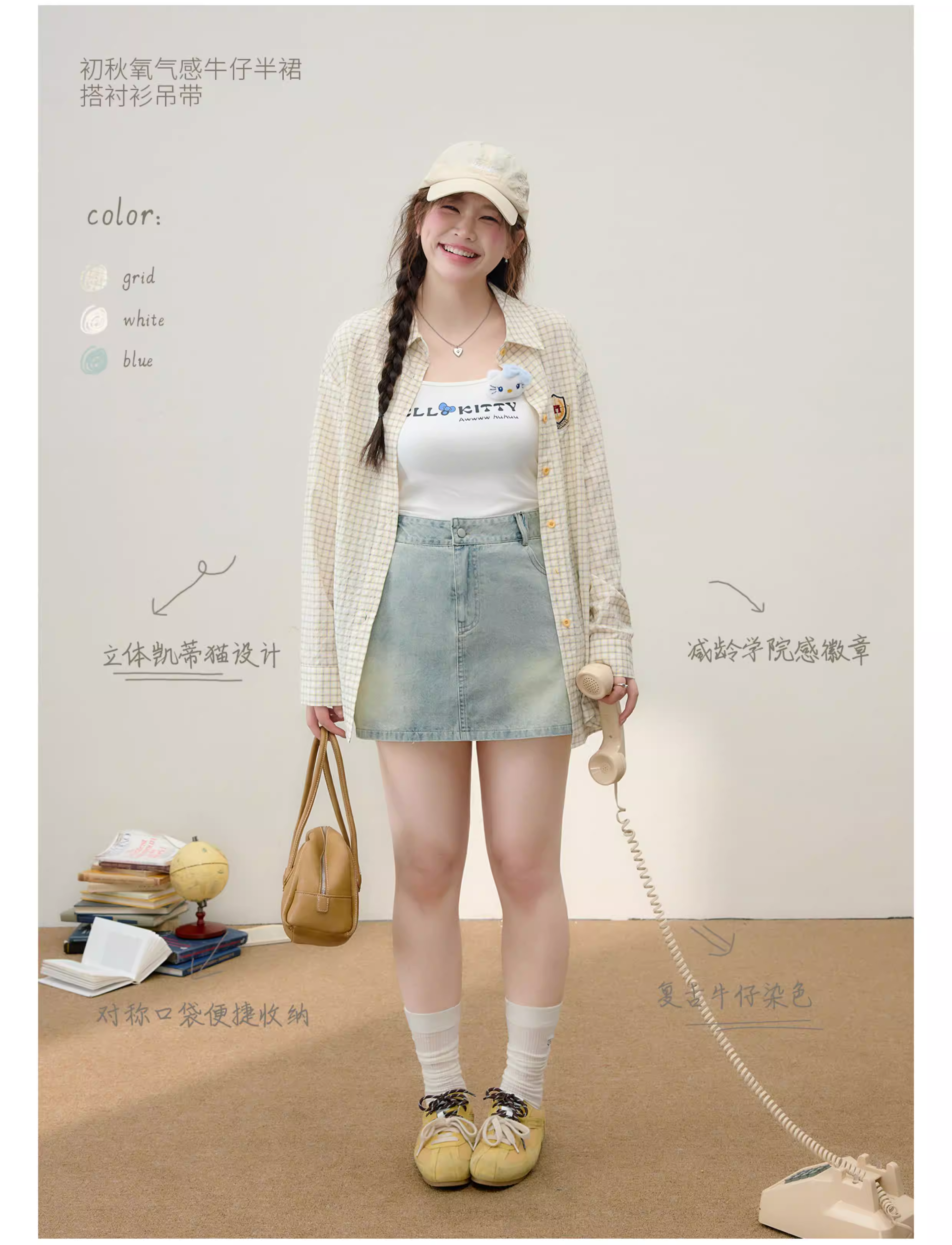 Quần áo nữ cỡ lớn cho đầu thu, bộ trang phục tôn dáng, chân váy denim phong cách Hàn Quốc phối áo sơ mi và áo camisole.