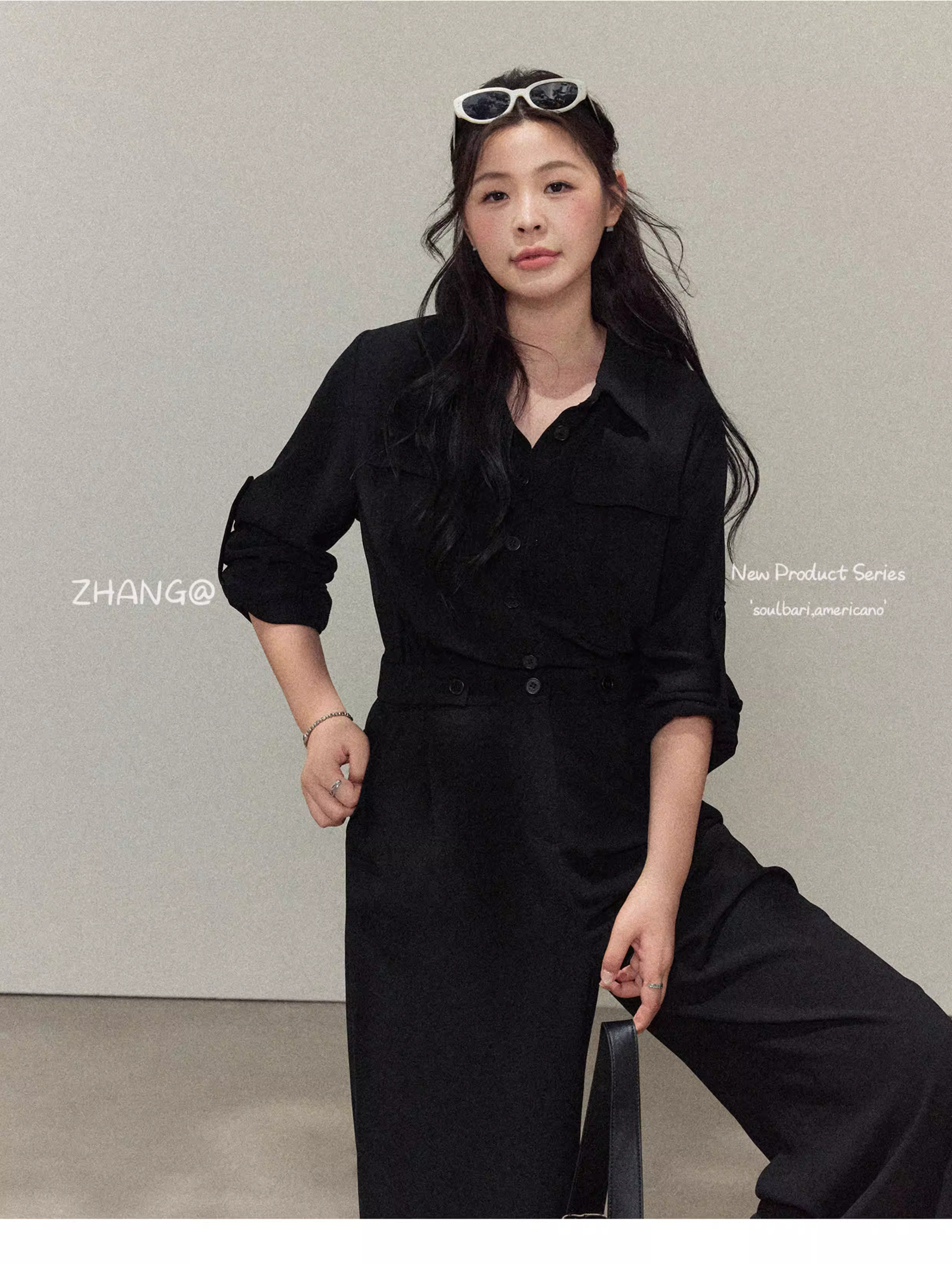 - Quần áo nữ cỡ lớn dành cho các cô gái hơi mũm mĩm, trang phục thu đông giúp thon gọn, bộ jumpsuit áo sơ mi đen phong cách quý tộc cổ điển.