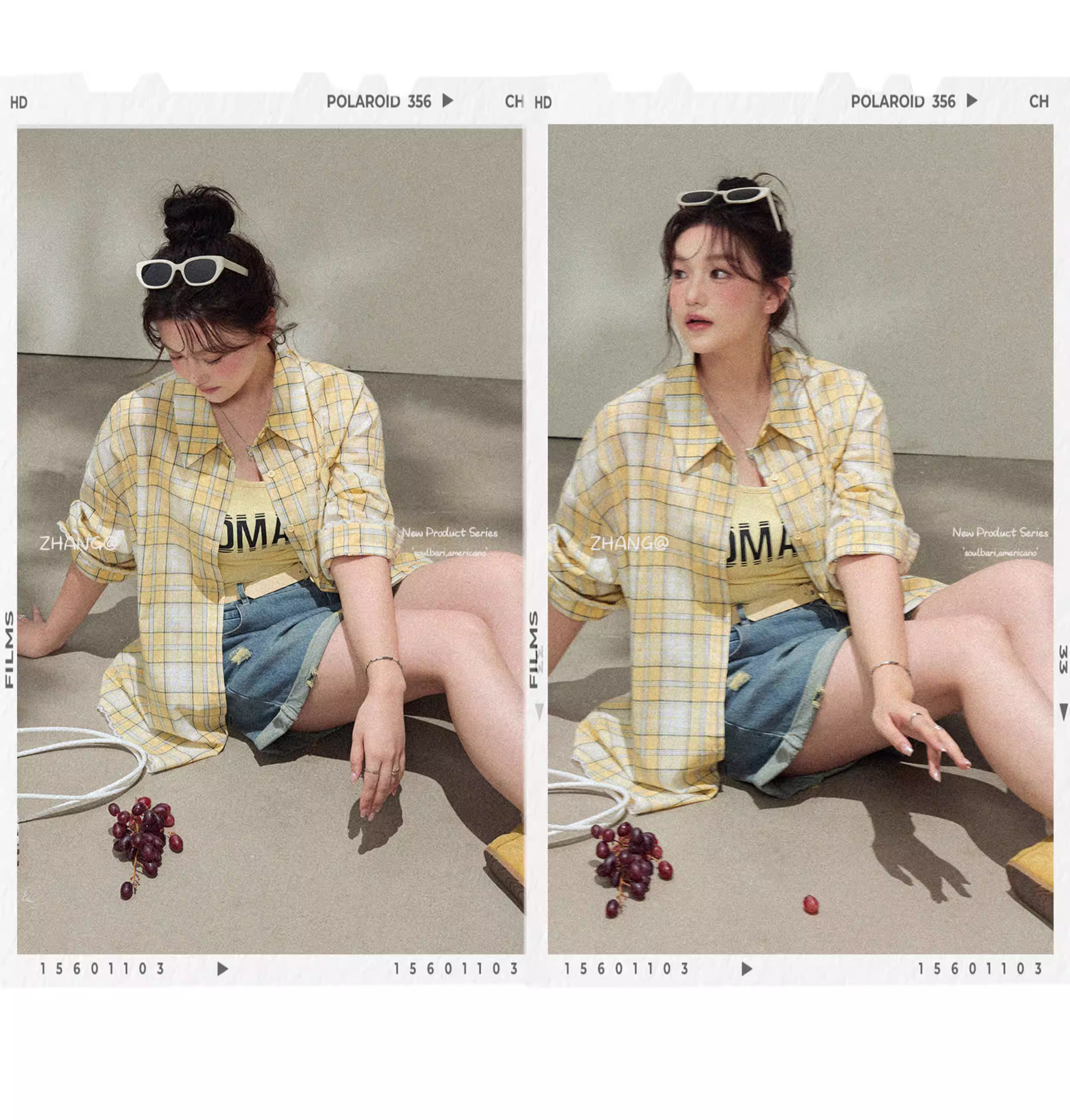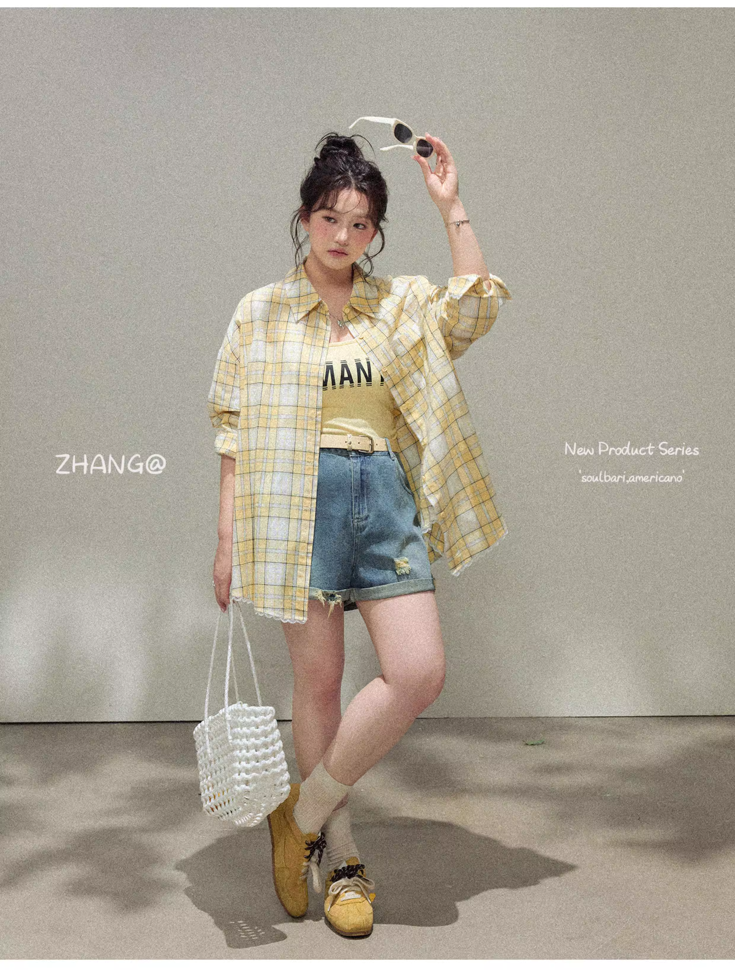 - Quần áo nữ cỡ lớn dành cho người lớn, phong cách lười biếng, áo sơ mi kẻ sọc vàng tôn dáng, áo hai dây, bộ quần short denim.