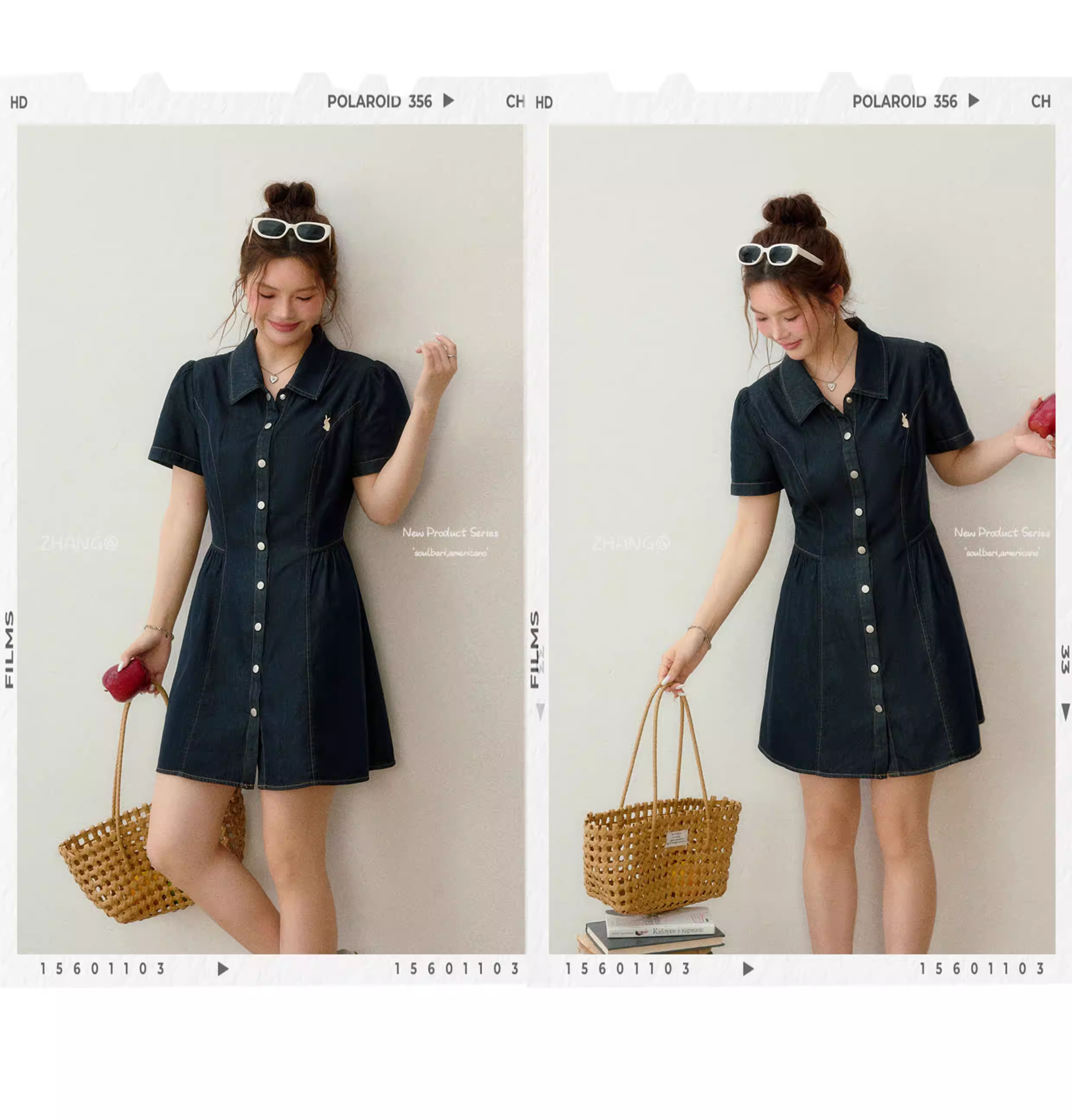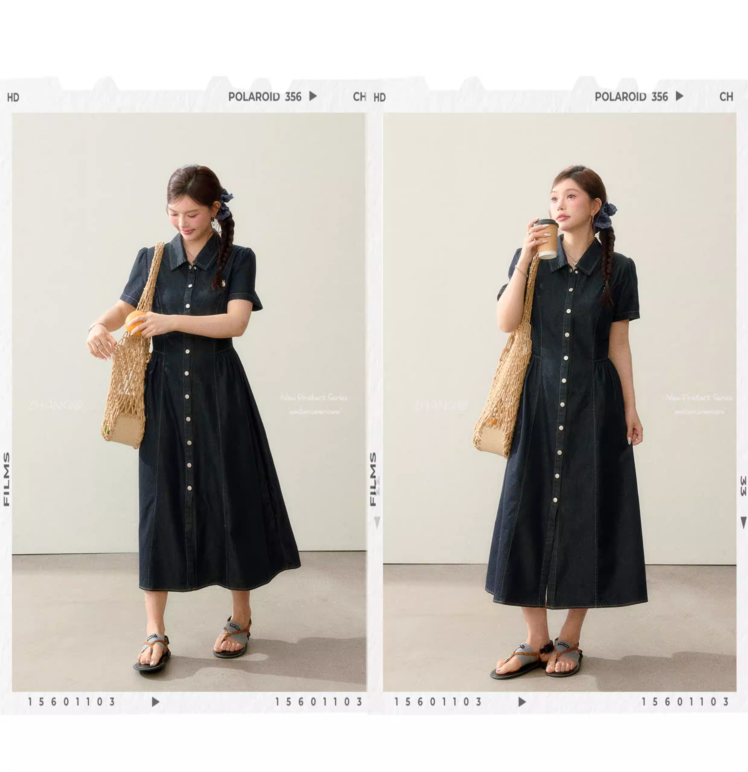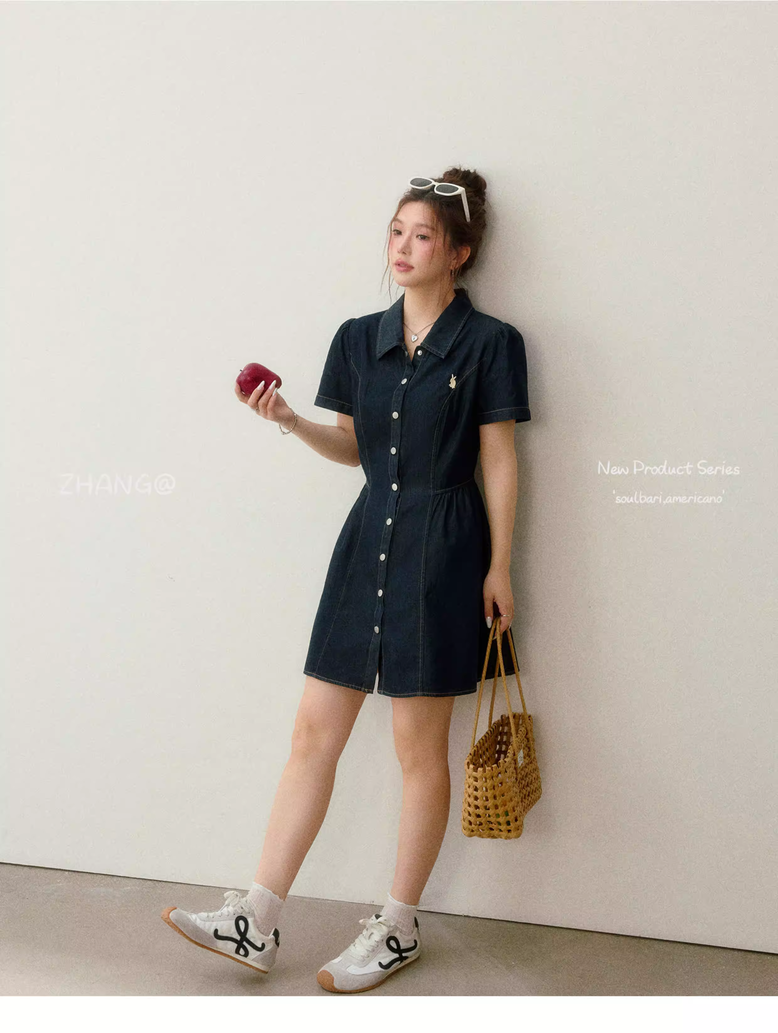 - Quần áo nữ cỡ lớn dành cho người lớn, phong cách mới mùa hè, tôn dáng, cổ áo polo ngọt ngào và mát mẻ, váy denim cổ điển ôm eo.