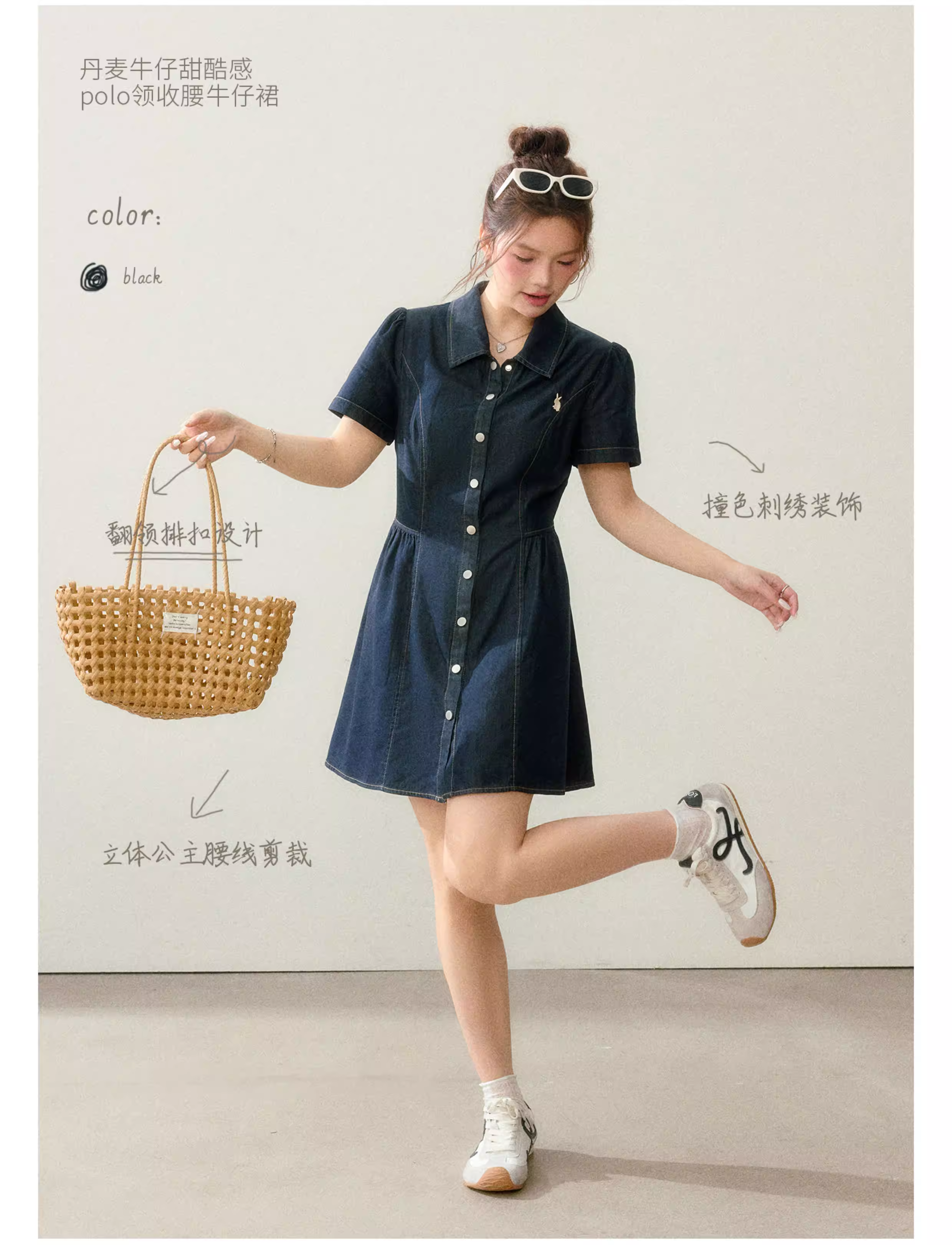 Quần áo nữ cỡ lớn dành cho người lớn, phong cách mới mùa hè, tôn dáng, cổ áo polo ngọt ngào và mát mẻ, váy denim cổ điển ôm eo.