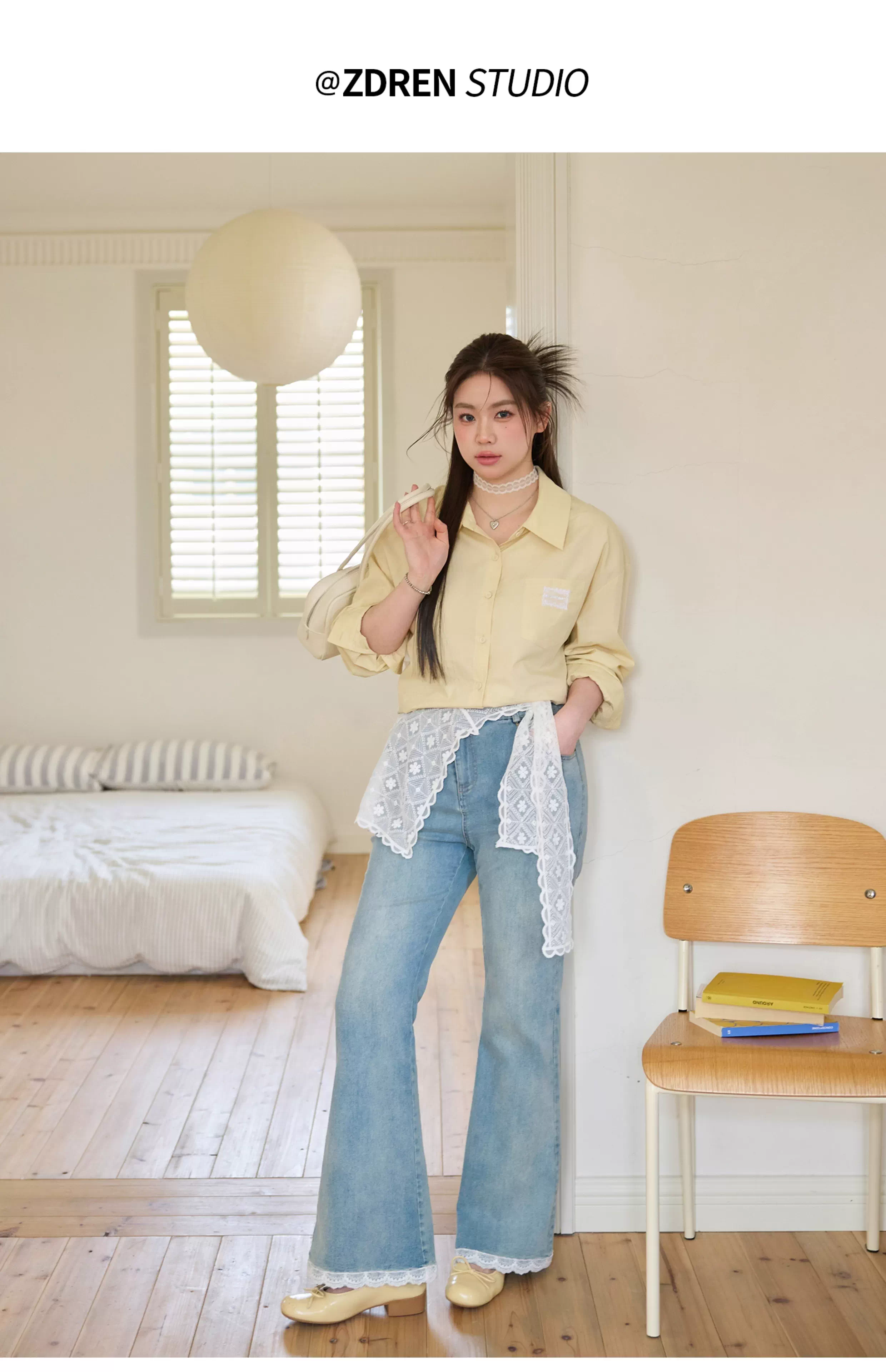 - Quần áo nữ cỡ lớn dành cho người lớn, quần ống loe cạp cao, tôn dáng, che phủ toàn thân, quần jean phối ren cổ điển.