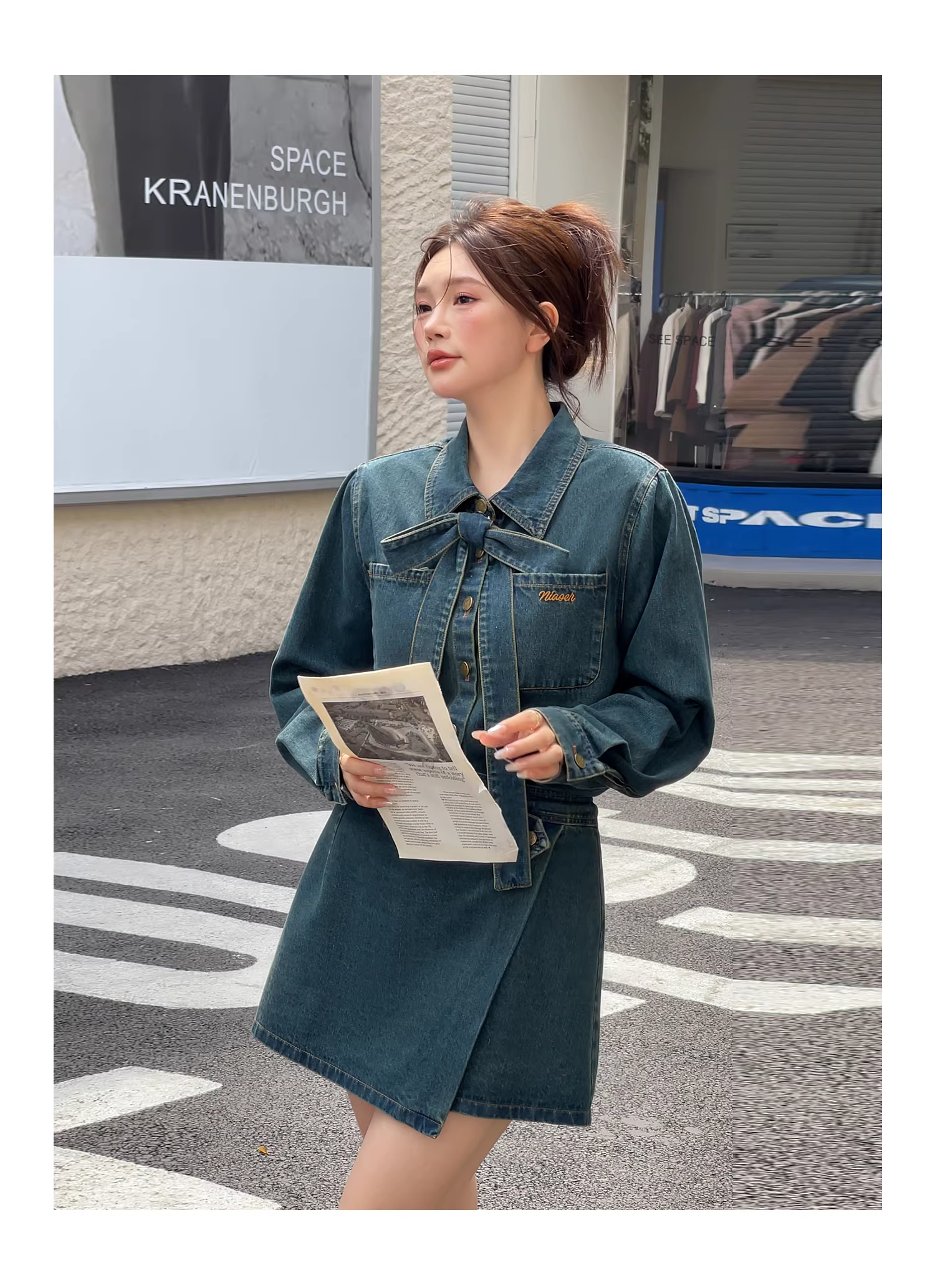 - Quần áo nữ cỡ lớn dành cho người lớn, trang phục mùa xuân tôn dáng, bộ đồ denim cổ điển, phong cách thanh lịch và cá tính, áo độc đáo, chân váy lưng cao.