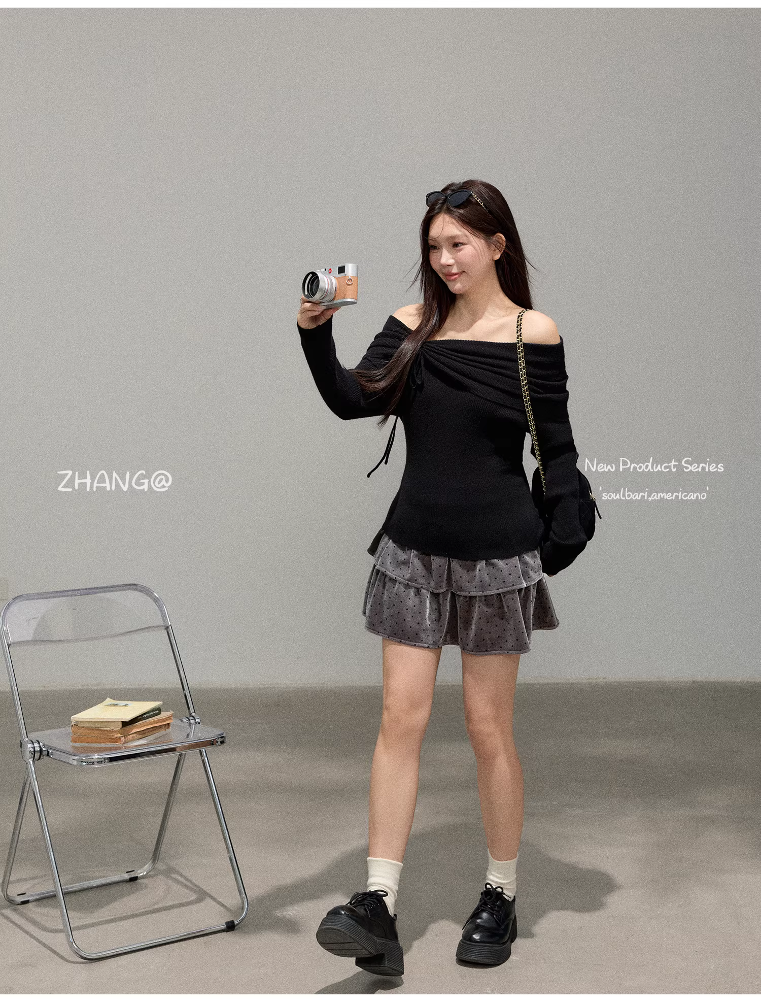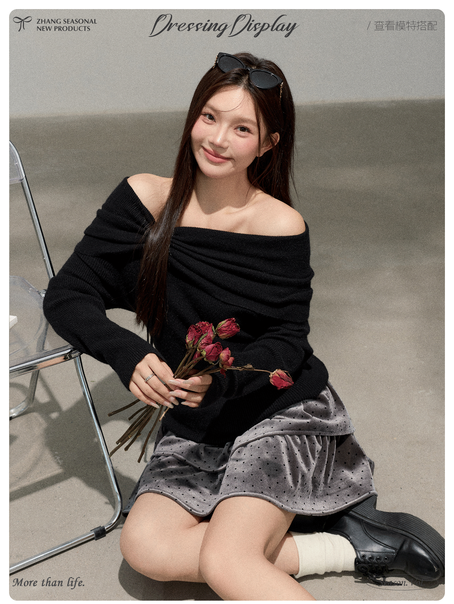 Quần áo nữ cỡ lớn dành cho người lớn, trang phục thon gọn cho các cô nàng mũm mĩm, phong cách thanh lịch, áo len trễ vai, chân váy nhung chấm bi.