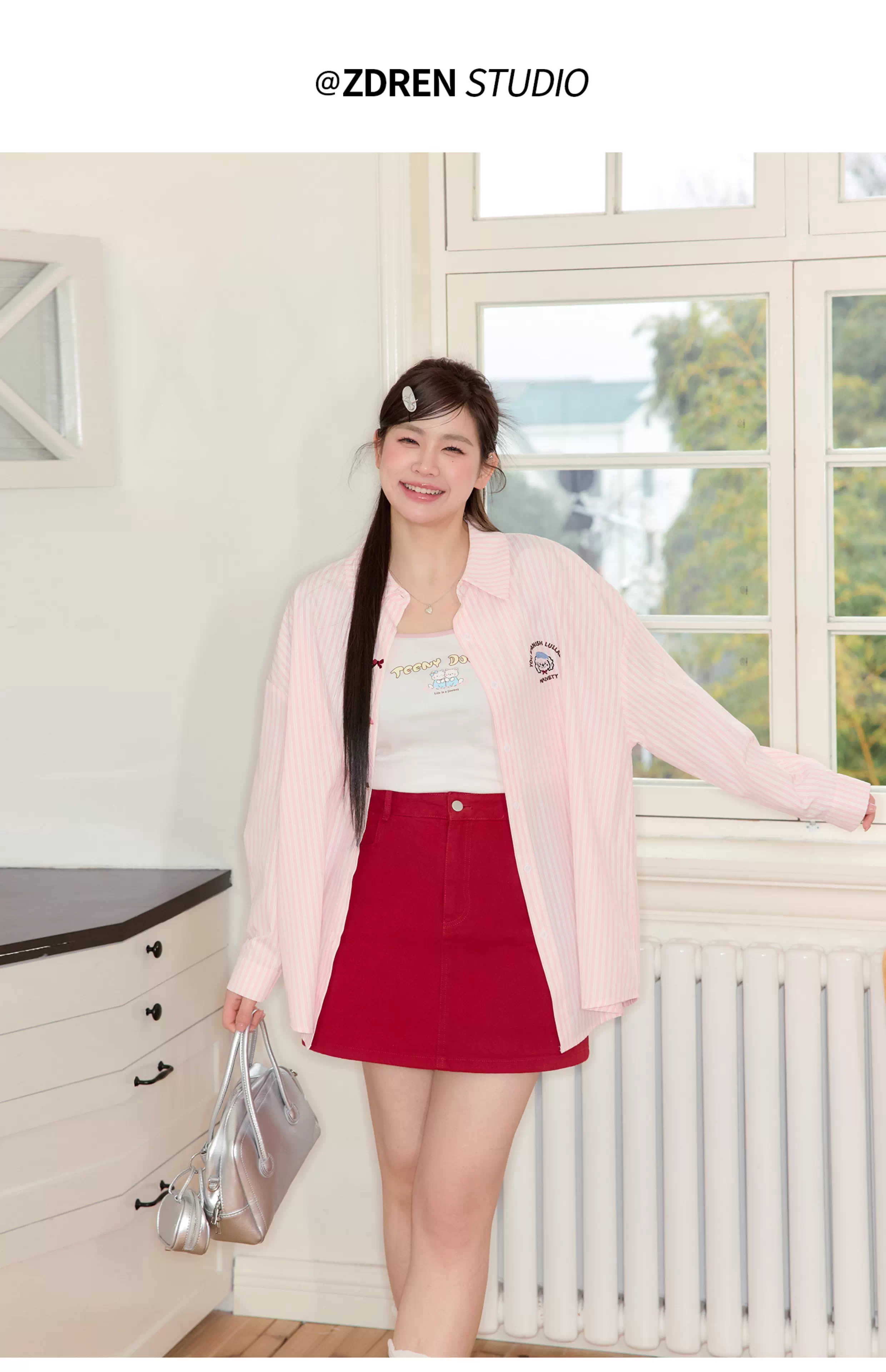 - Quần áo nữ cỡ lớn dành cho người lớn, trang phục thu đông tôn dáng, bộ áo sơ mi sọc và chân váy chữ A.