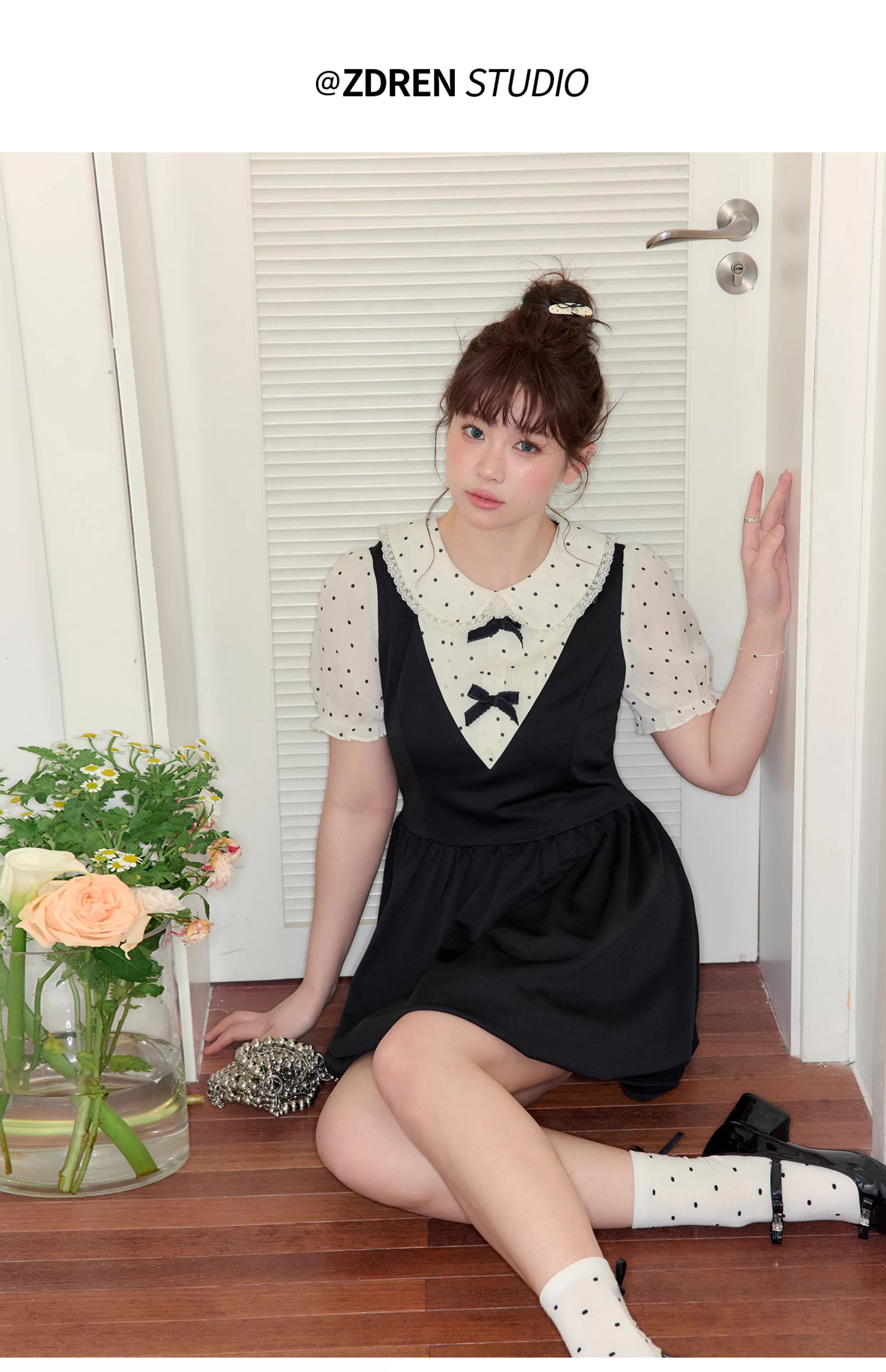 - Quần áo nữ cỡ lớn dành cho người lớn, váy mini kiểu cổ điển tôn dáng, váy giả hai mảnh kiểu Pháp chấm bi thắt eo.