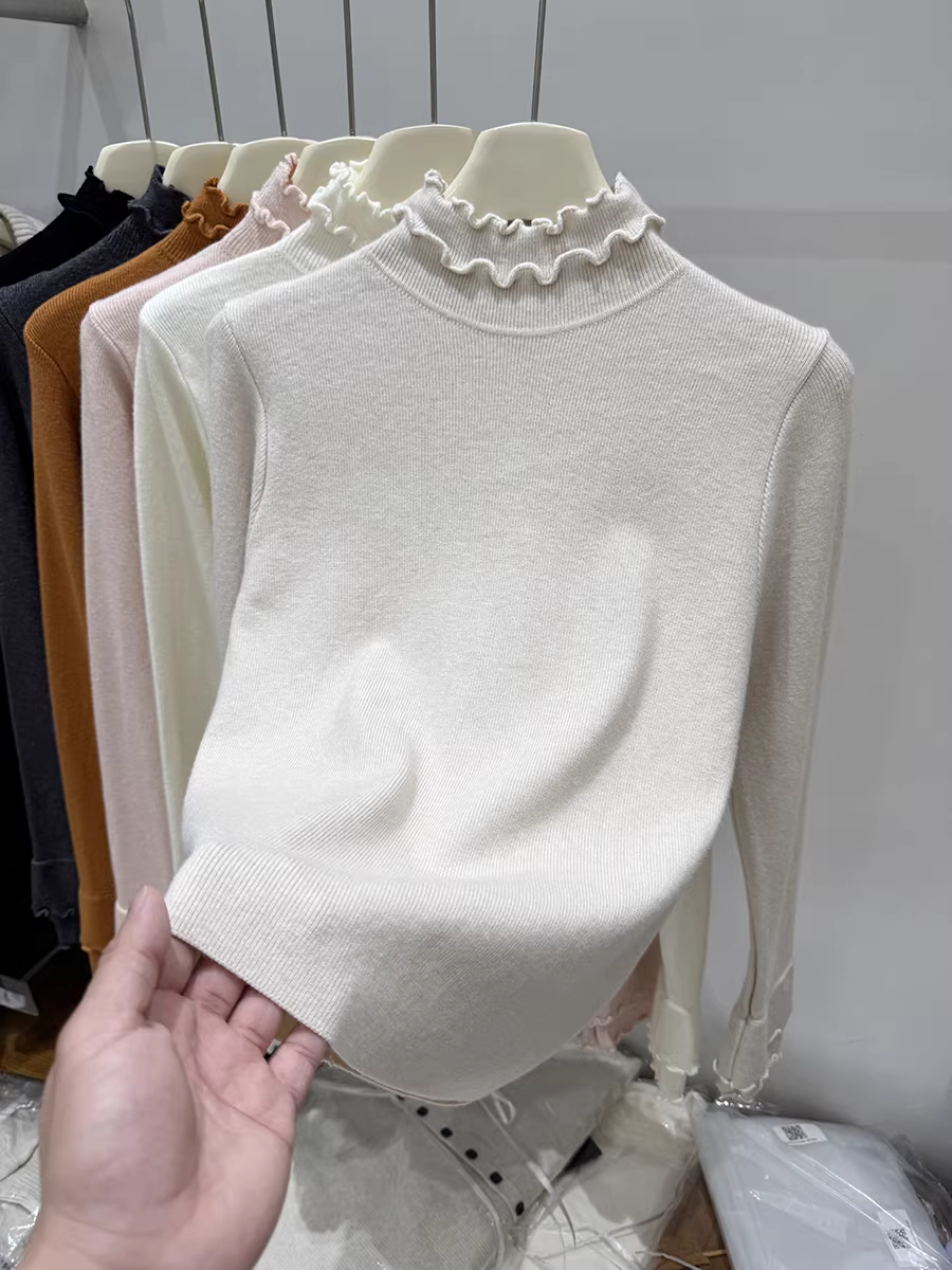 - Quần áo nữ giảm giá có nhãn hiệu, áo sơ mi dệt kim cổ cao nửa cổ xếp nếp ngọt ngào, áo lót dài tay mùa thu đông, hợp thời trang.