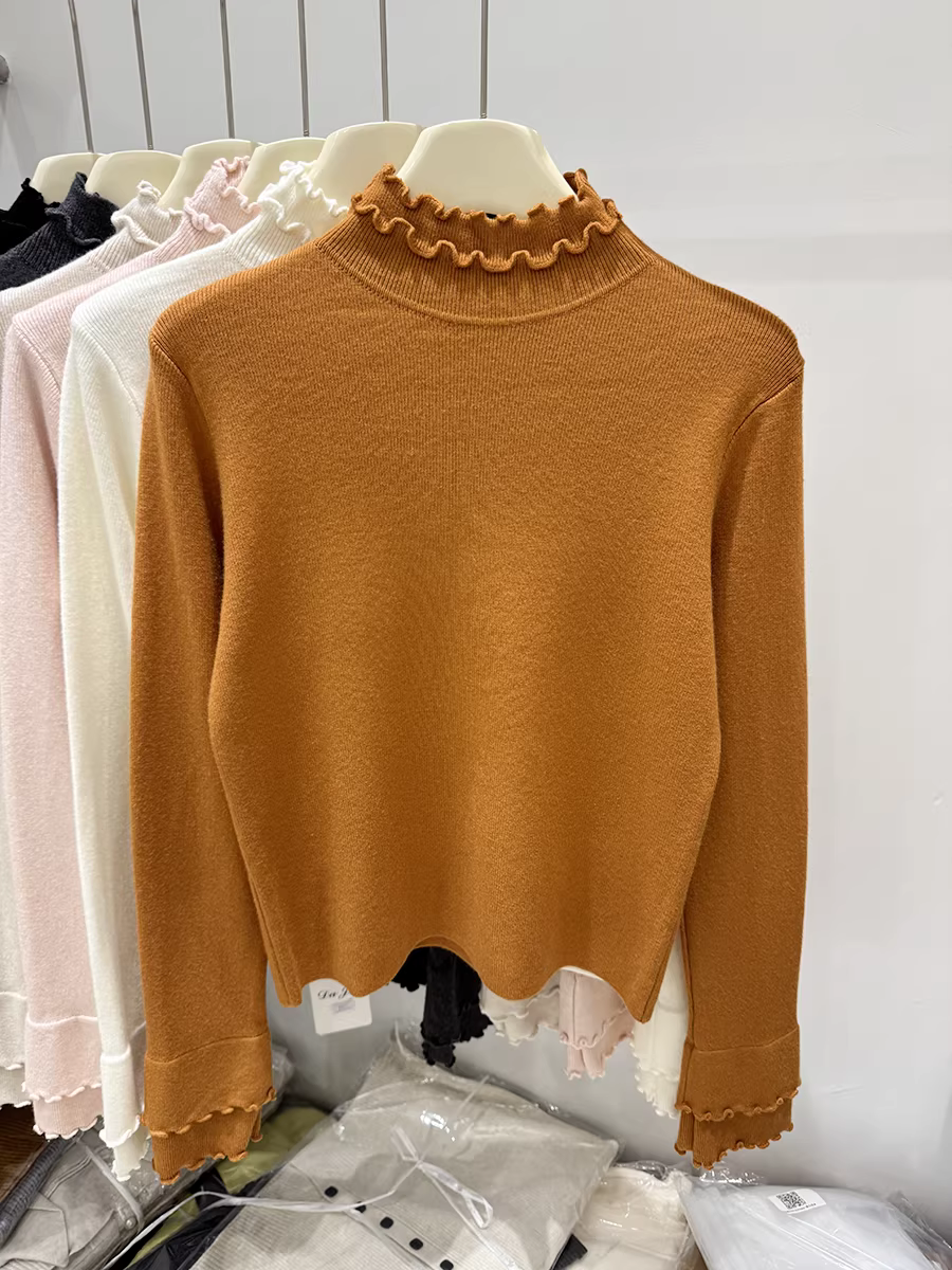 Quần áo nữ giảm giá có nhãn hiệu, áo sơ mi dệt kim cổ cao nửa cổ xếp nếp ngọt ngào, áo lót dài tay mùa thu đông, hợp thời trang.