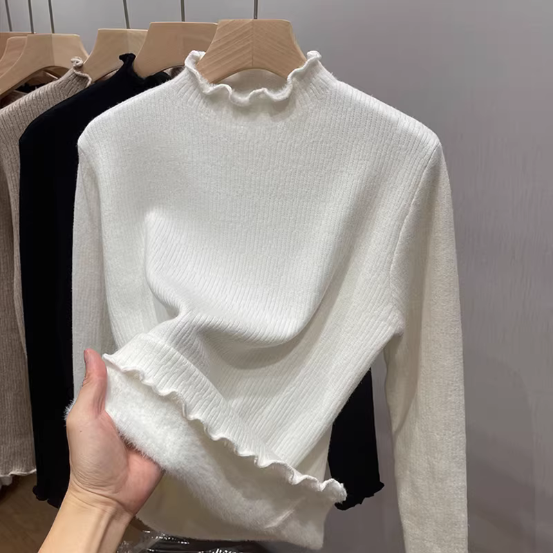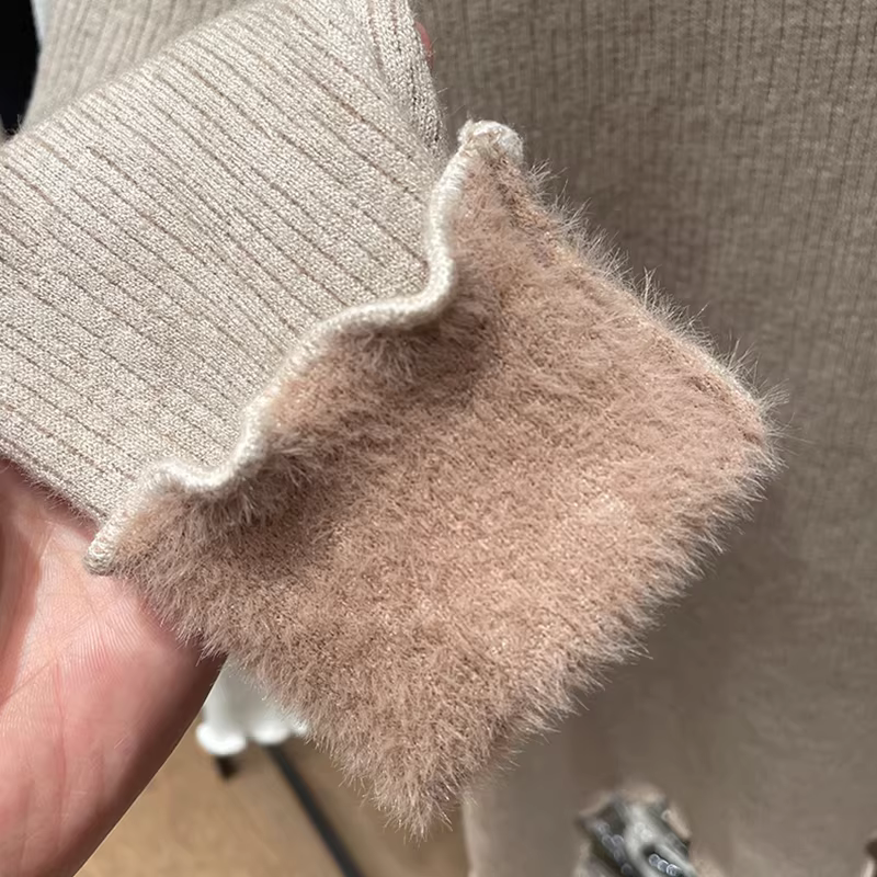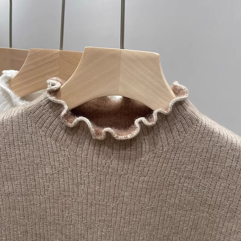 - Quần áo nữ giảm giá có nhãn hiệu, viền xếp ly, lớp lót bằng vải dệt kim lót lông cừu, cổ nửa cao, áo giữ ấm tích hợp lông cừu.