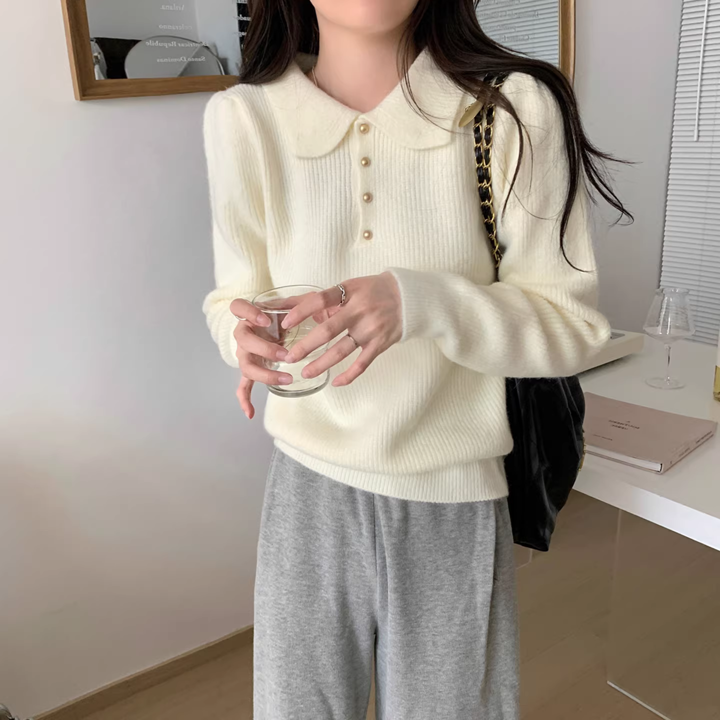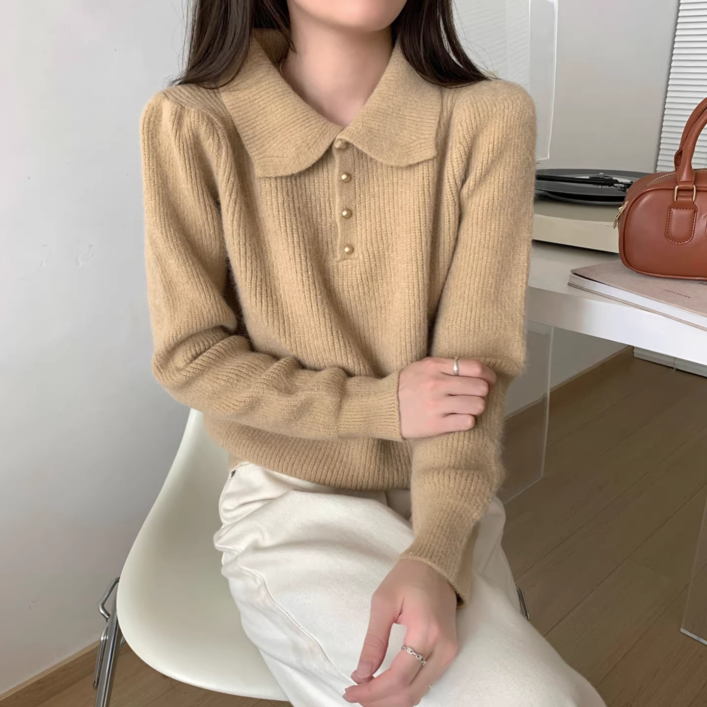- Quần áo nữ giảm giá có thương hiệu, áo len cổ polo cắt nhãn, áo len nữ mùa thu đông mềm mại và ấm áp, kiểu dáng lười biếng.