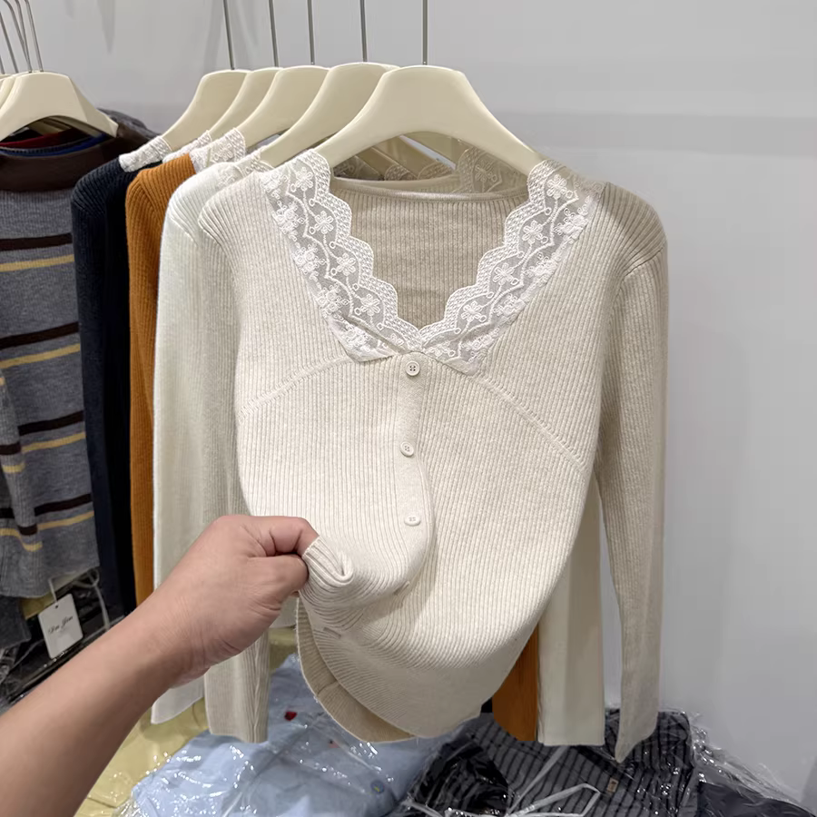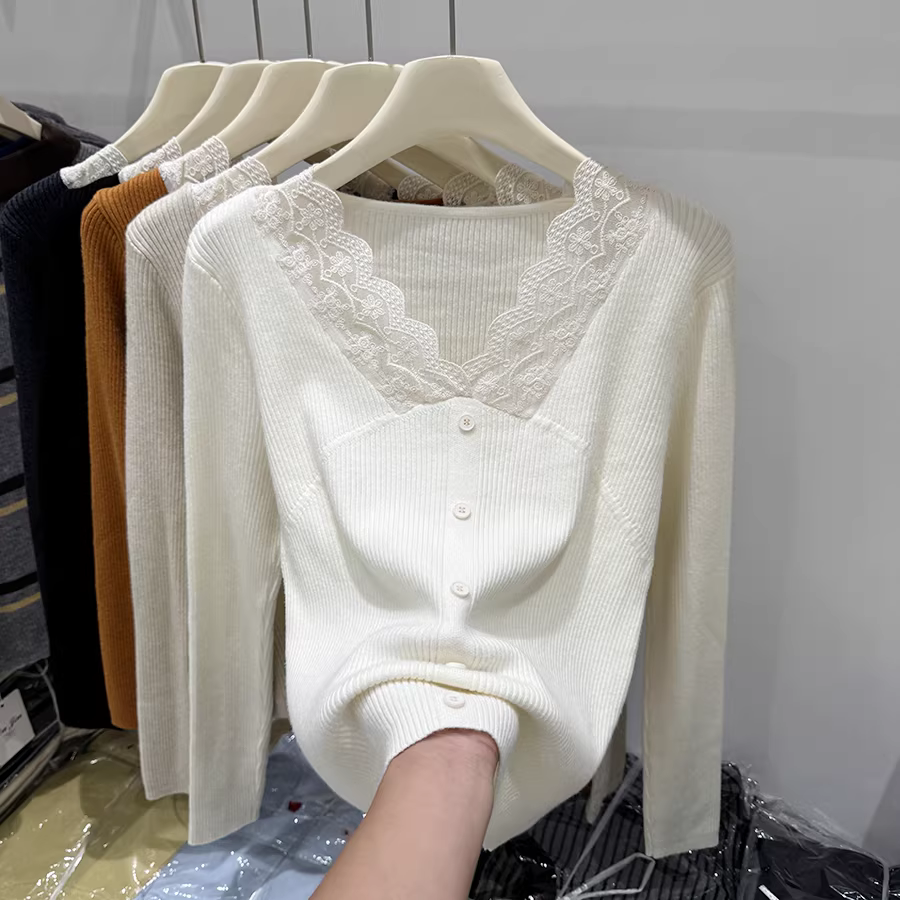 Quần áo nữ giảm giá có thương hiệu, áo sơ mi dệt kim cổ chữ V có nhãn cắt, phối ren, lớp trong mùa thu đông, dáng ôm, áo len giảm béo, hợp thời trang.